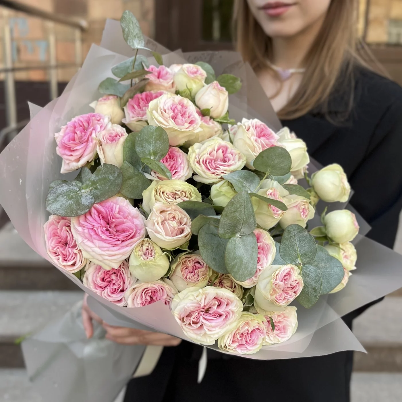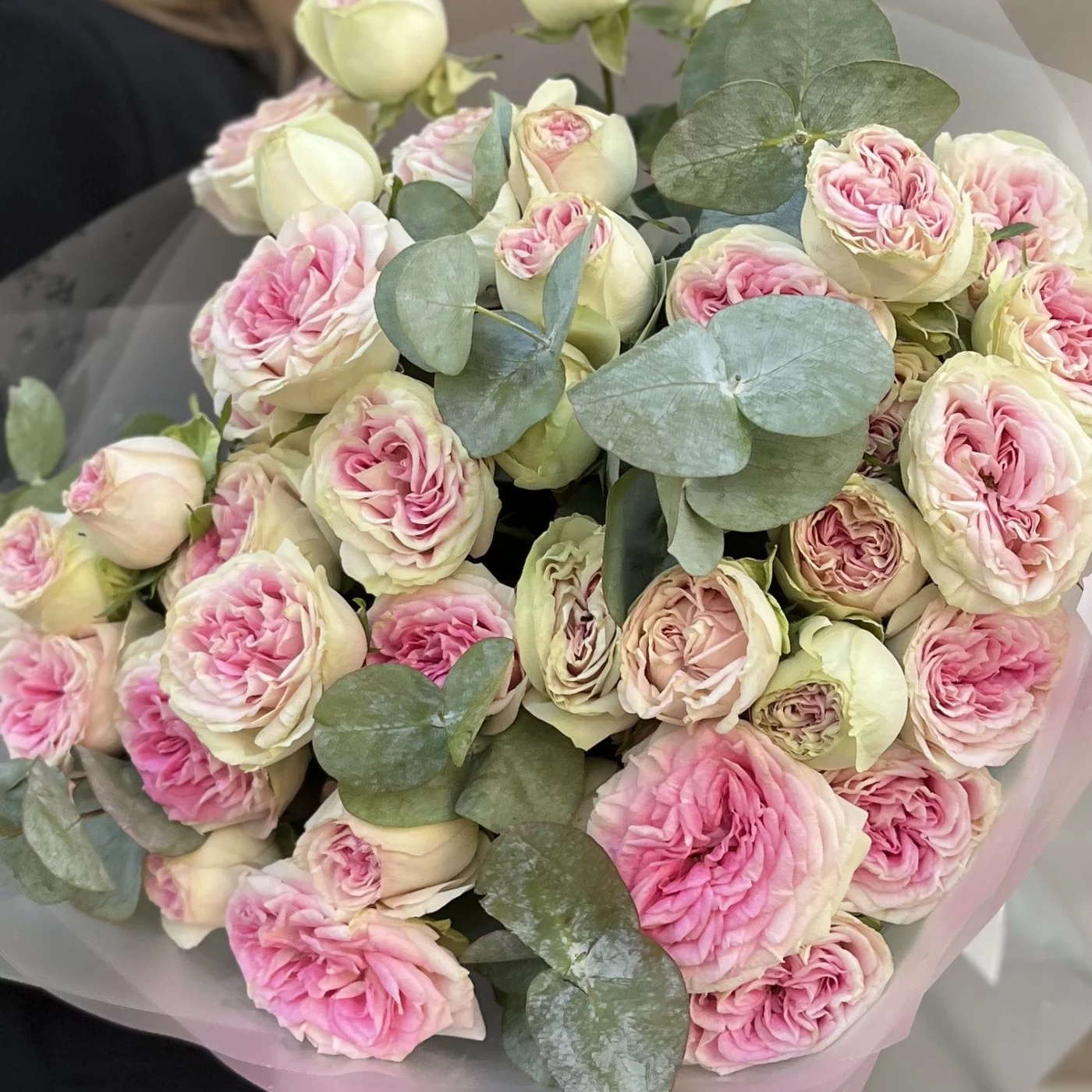 9 кустовых пионовидных роз Джелатто 50 см с эвкалиптом