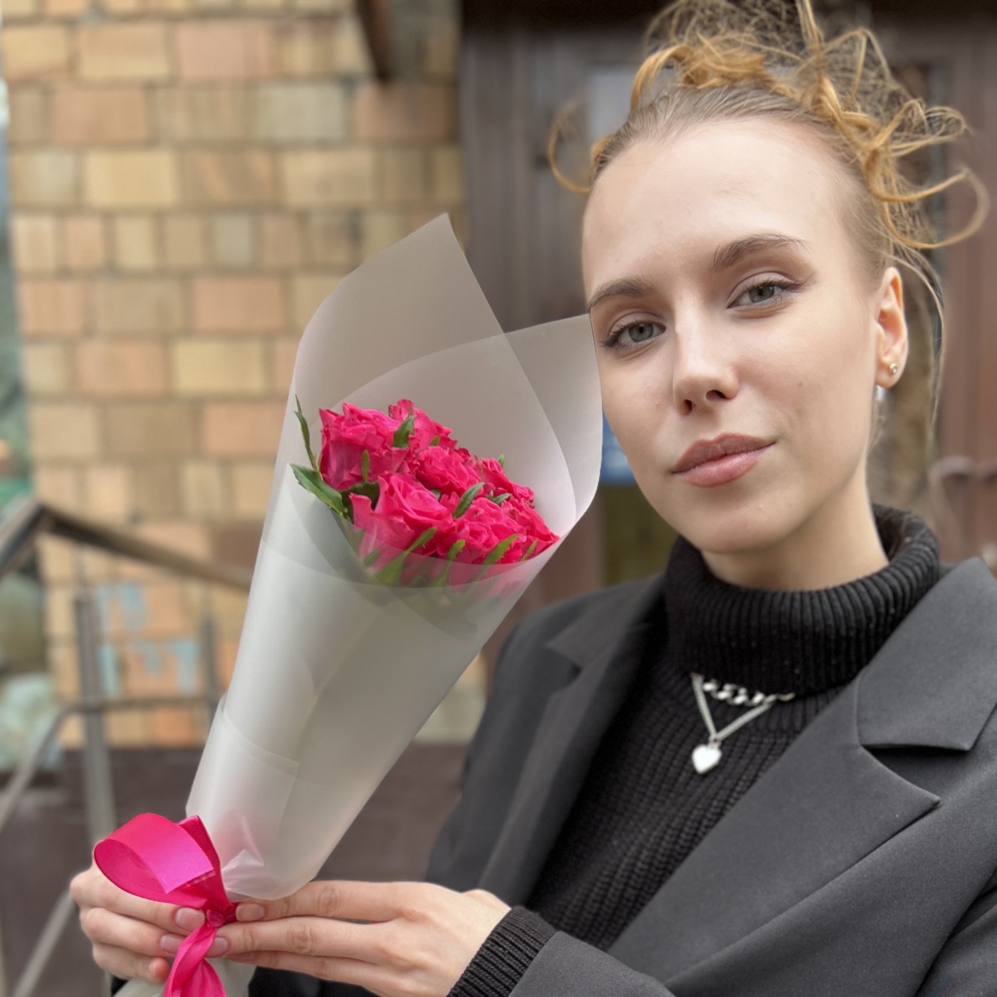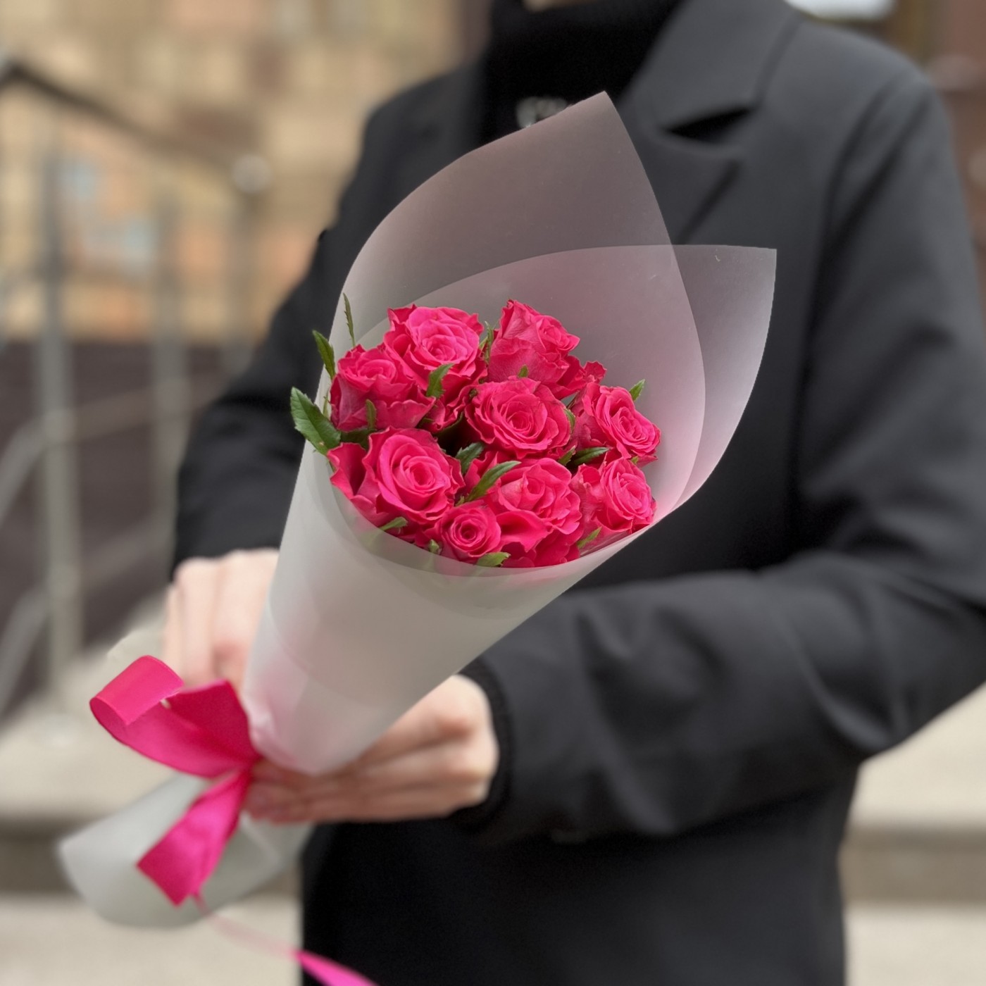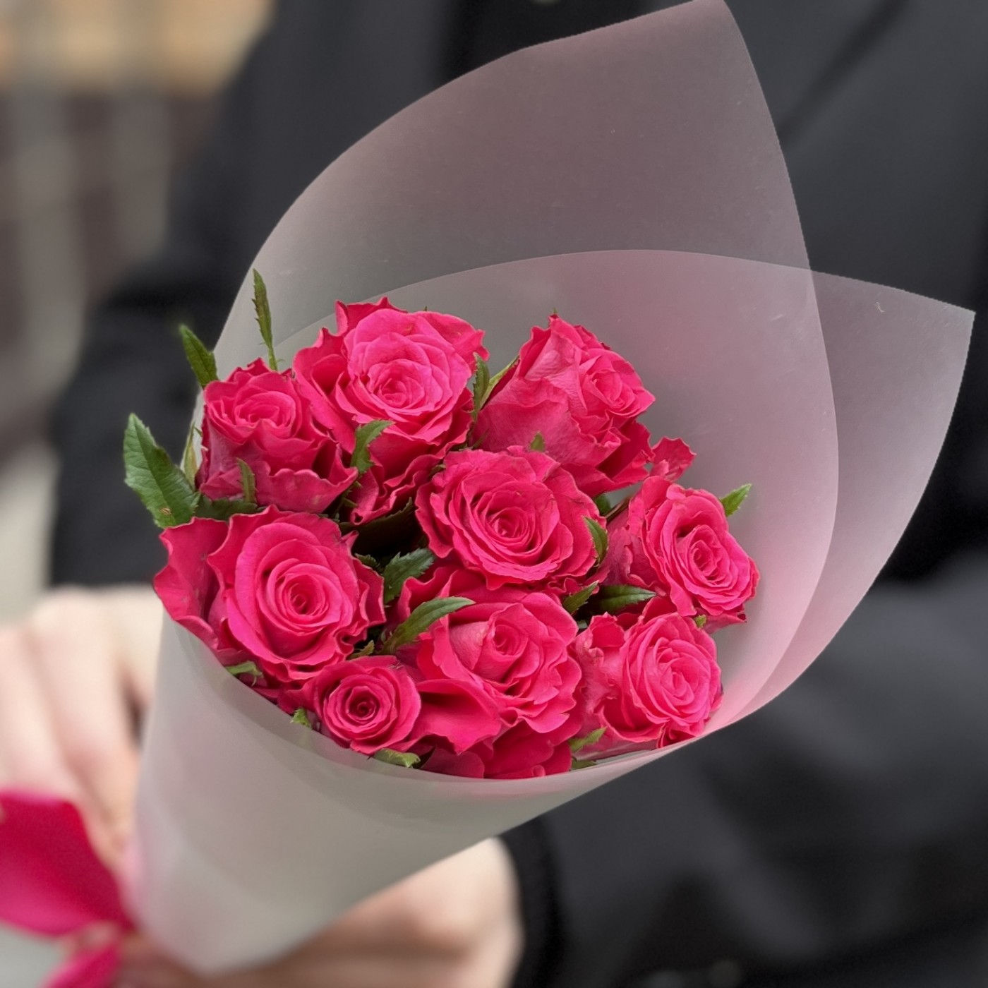 Букет из 9 малиновых роз сорта Вайлд Калипсо длиной 35 см — это яркая и насыщенная композиция, которая привлекает внимание своим глубоким малиновым оттенком и компактным размером.