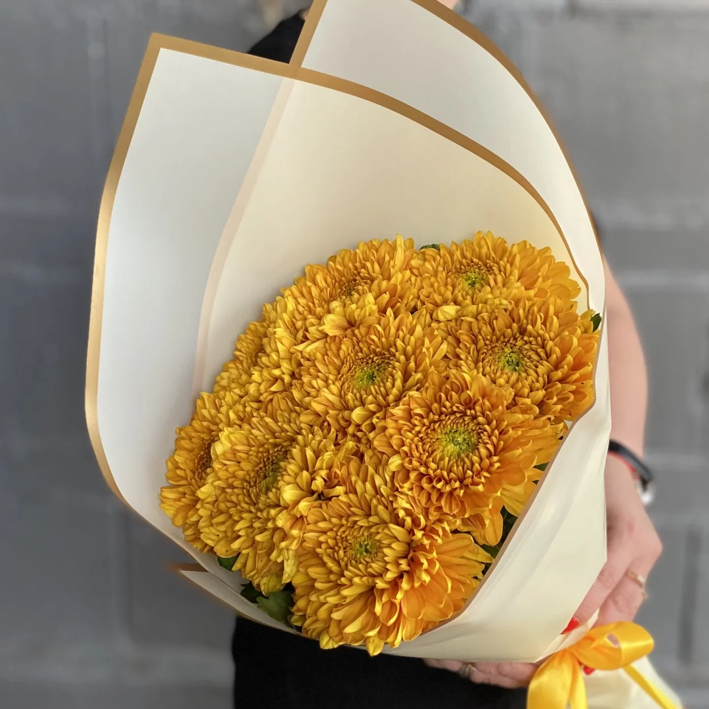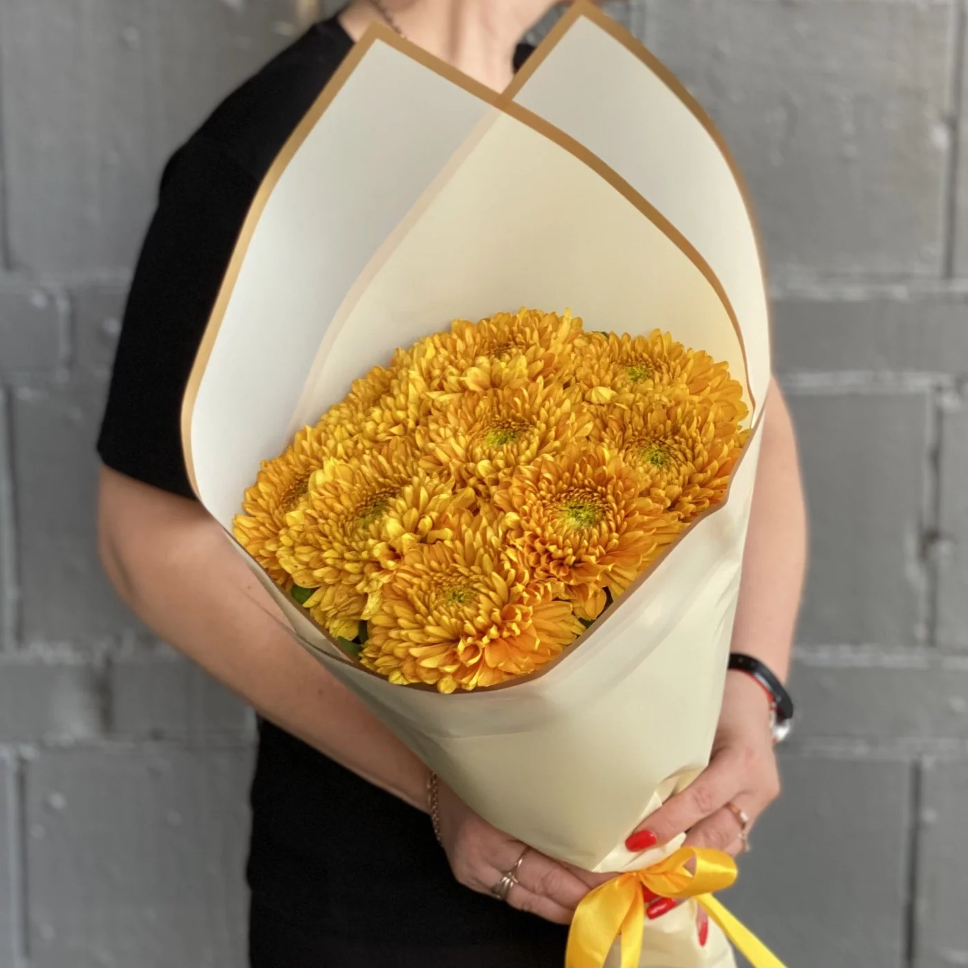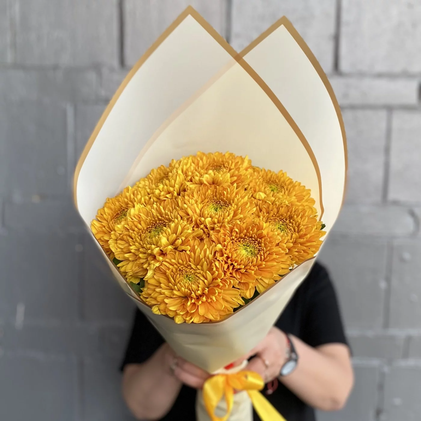 9 крупных оранжевых хризантем — это отличный вариант подарка девушке или женщине по любому поводу.