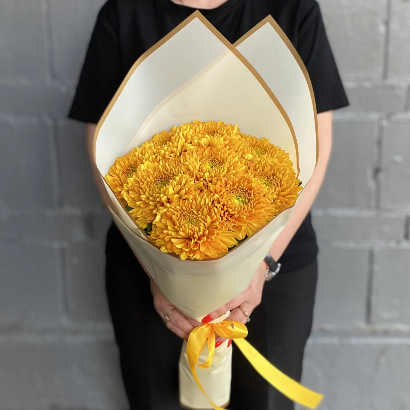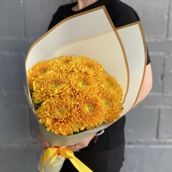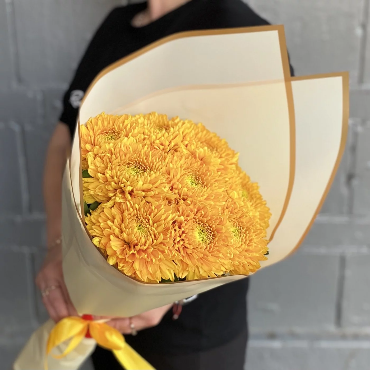 9 крупных оранжевых хризантем — это отличный вариант подарка девушке или женщине по любому поводу.