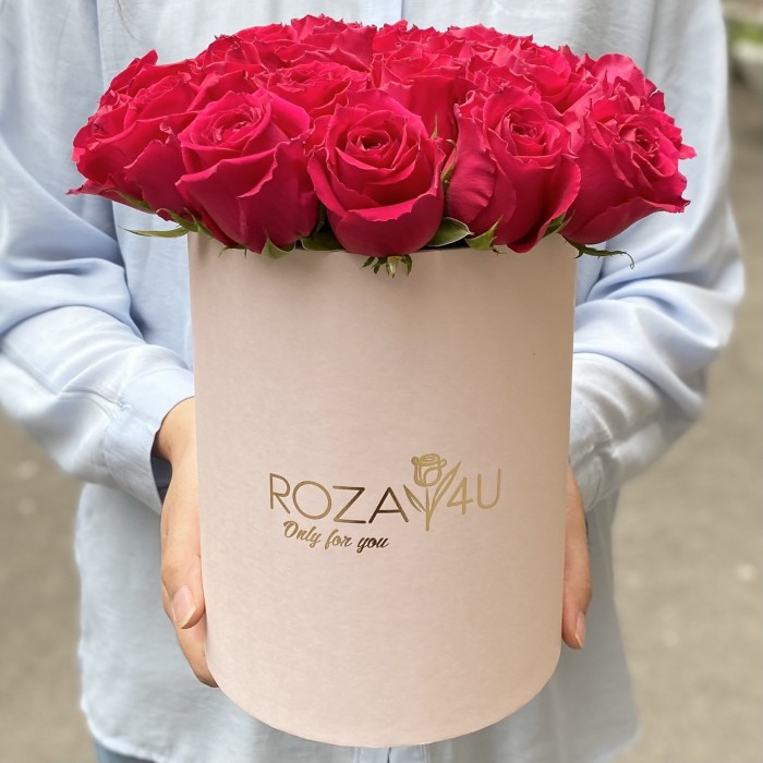 Композиция из 25 малиновых роз сорта Такаци в фирменной круглой коробочке. Яркая летняя композиция из роз по поводу и без повода принесет радость и душевную гармонию в ваши отношения. Красота свежих и ярких цветов скажет за Вас о любви и нежности на языке, понятном каждой девушке.