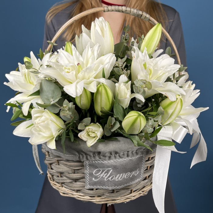 Композиция из 9 пионовидных белых лилий в корзине — символ чистоты и безупречного вкуса. Объёмные белоснежные бутоны раскрываются мягко и величественно, источая свежесть и лёгкость. Натуральная корзина подчёркивает природную красоту цветов, создавая ощущение гармонии, покоя и изысканной утончённости.