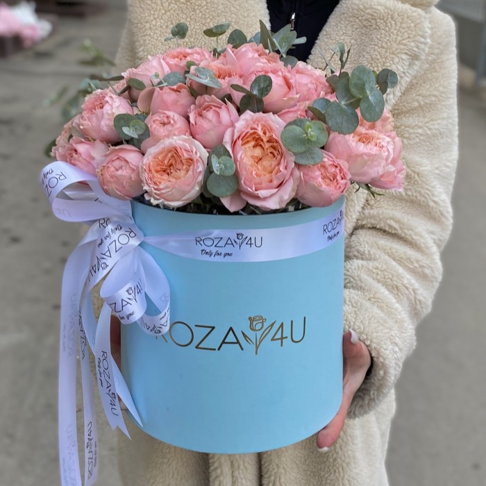 Шикарная шляпная коробка из кустовой пионовидной розы Дэульетта с ароматным эвкалиптом принесет улыбку и радостное настроение получательнице. Эти цветы станут прекрасным комплиментом женской красоте и расскажут о ваших чувствах.