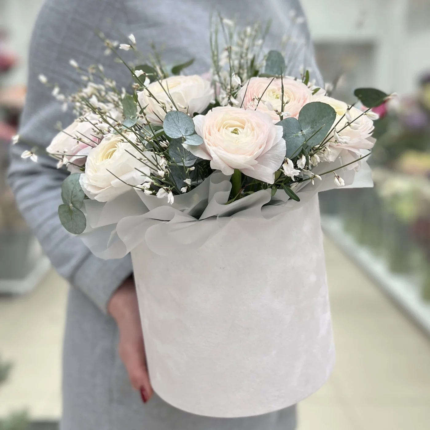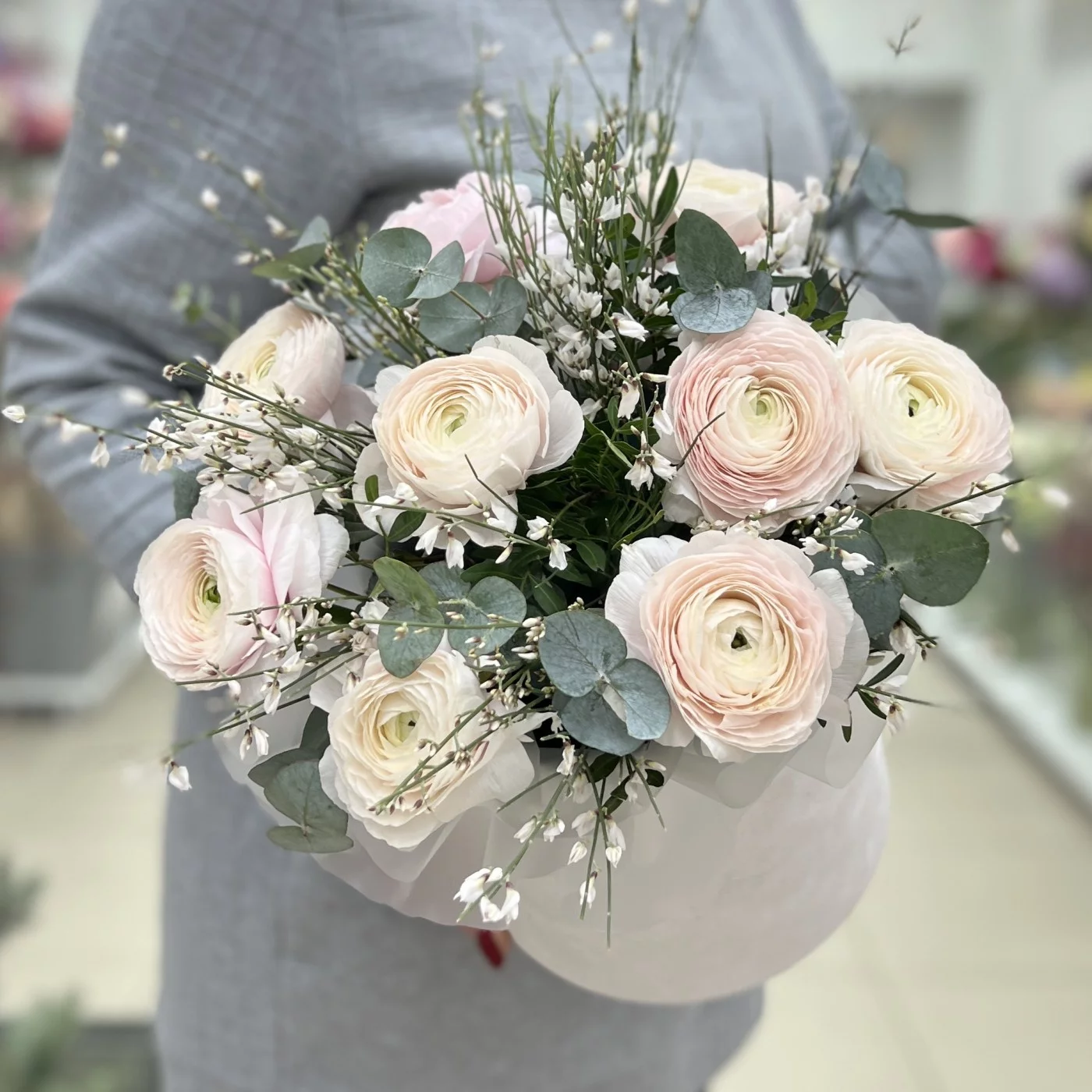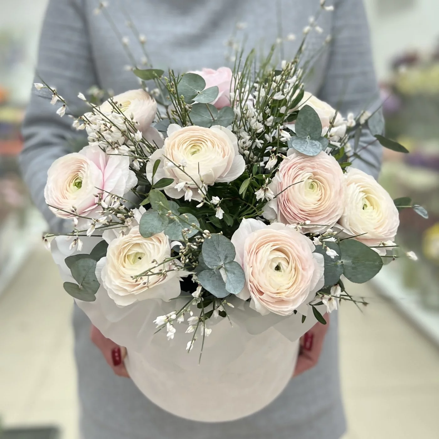 9 пышных ранункулюсов, дополненных яркой генистой, представлен в стильной бархатной коробке. Это идеальный подарок, который сочетает в себе элегантность и оригинальность, создавая впечатляющую композицию для любого праздника.