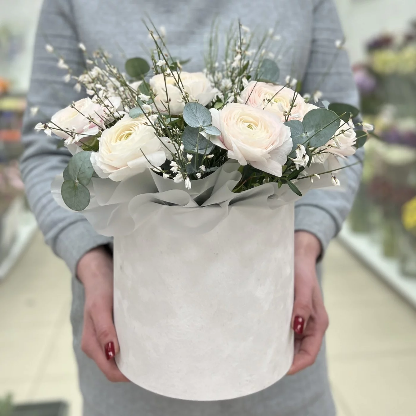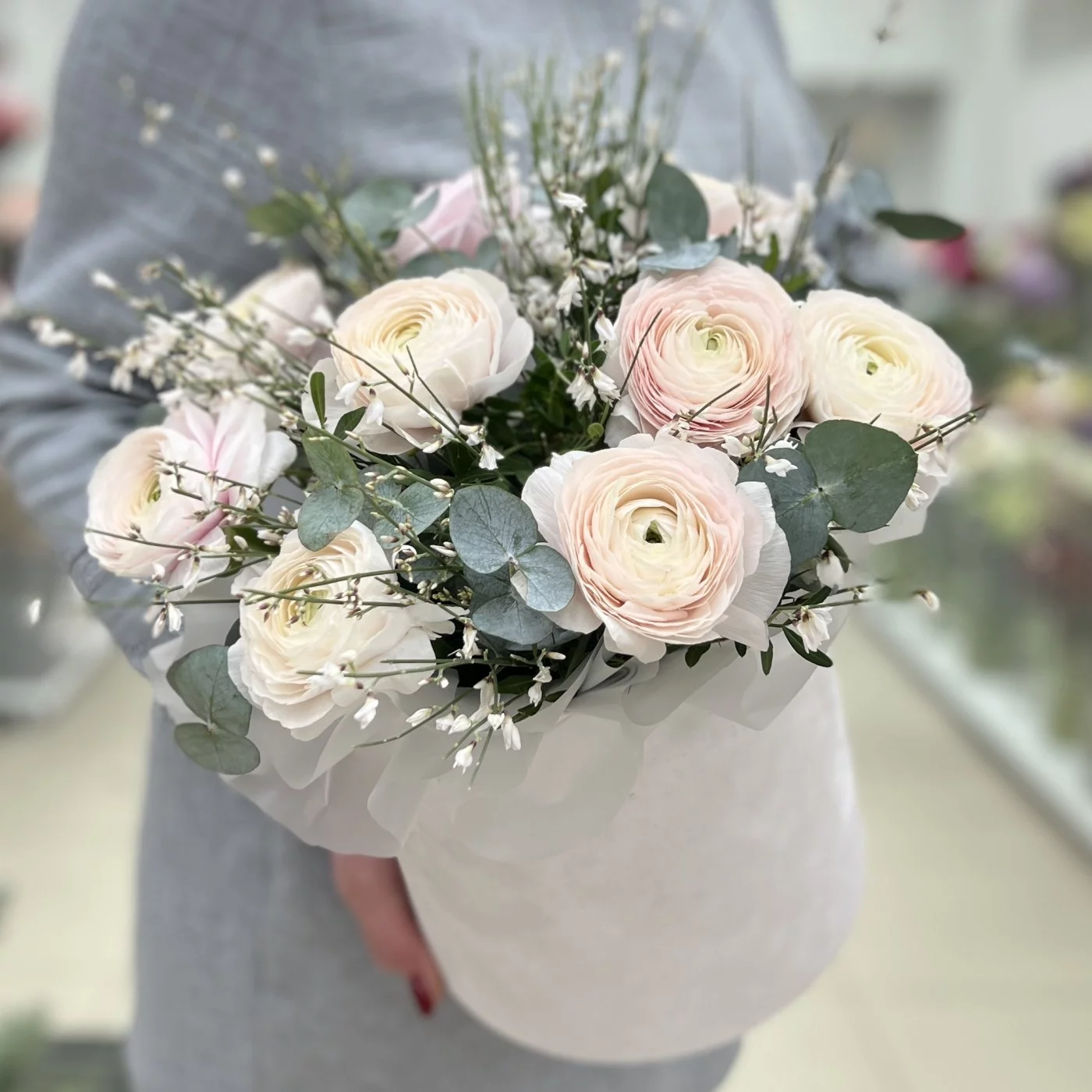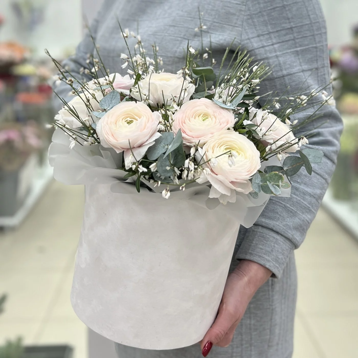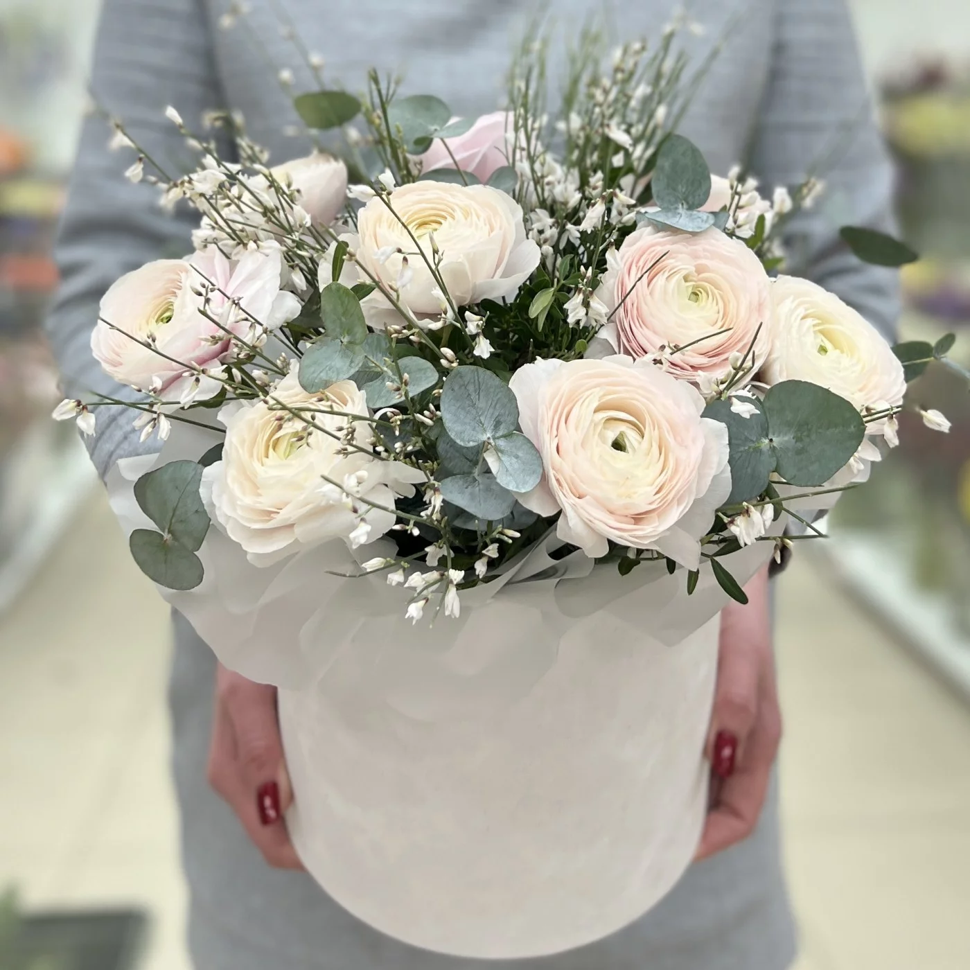 9 пышных ранункулюсов, дополненных яркой генистой, представлен в стильной бархатной коробке. Это идеальный подарок, который сочетает в себе элегантность и оригинальность, создавая впечатляющую композицию для любого праздника.