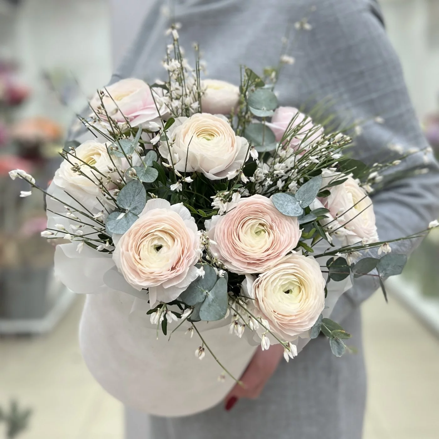 9 пышных ранункулюсов с генистой в бархатной коробке