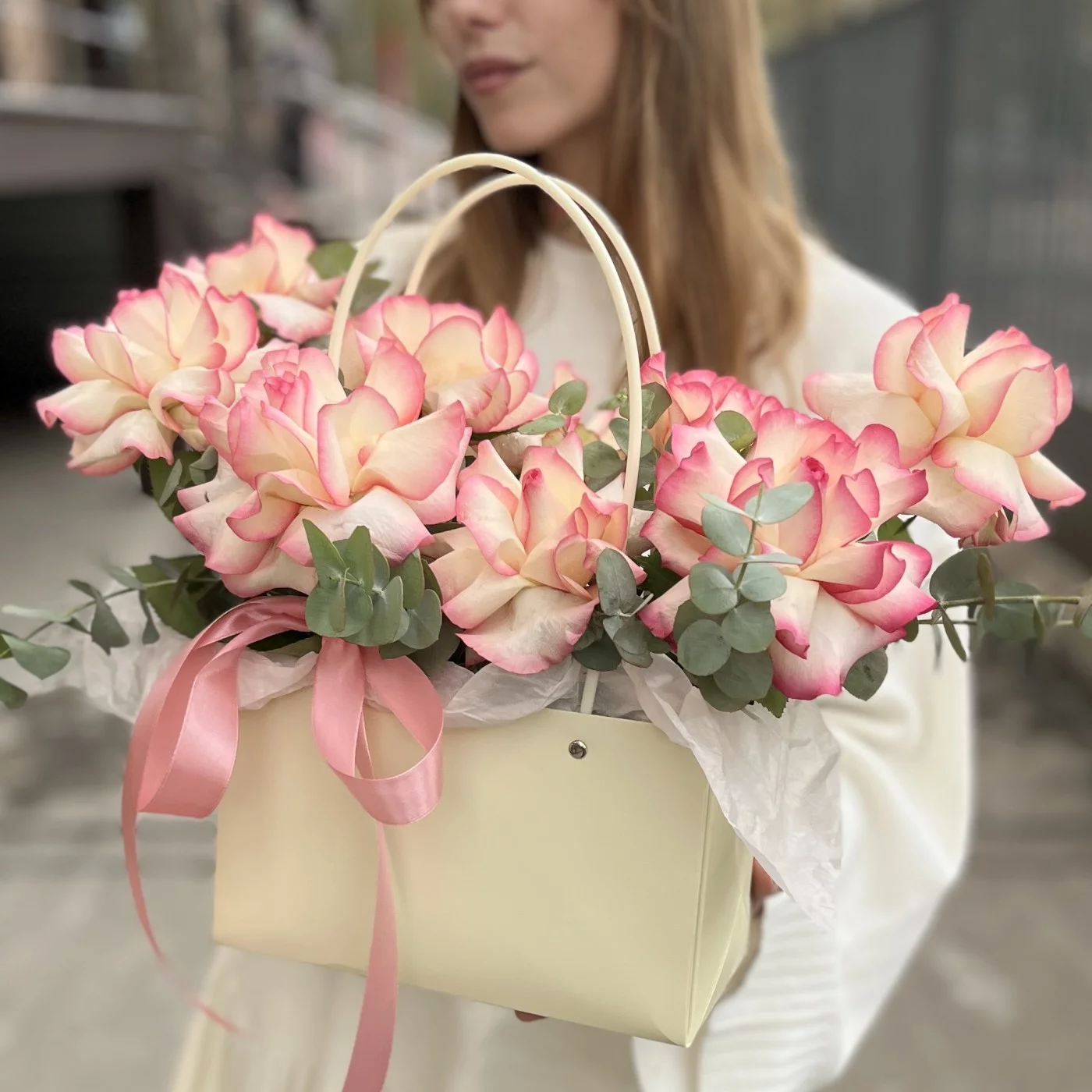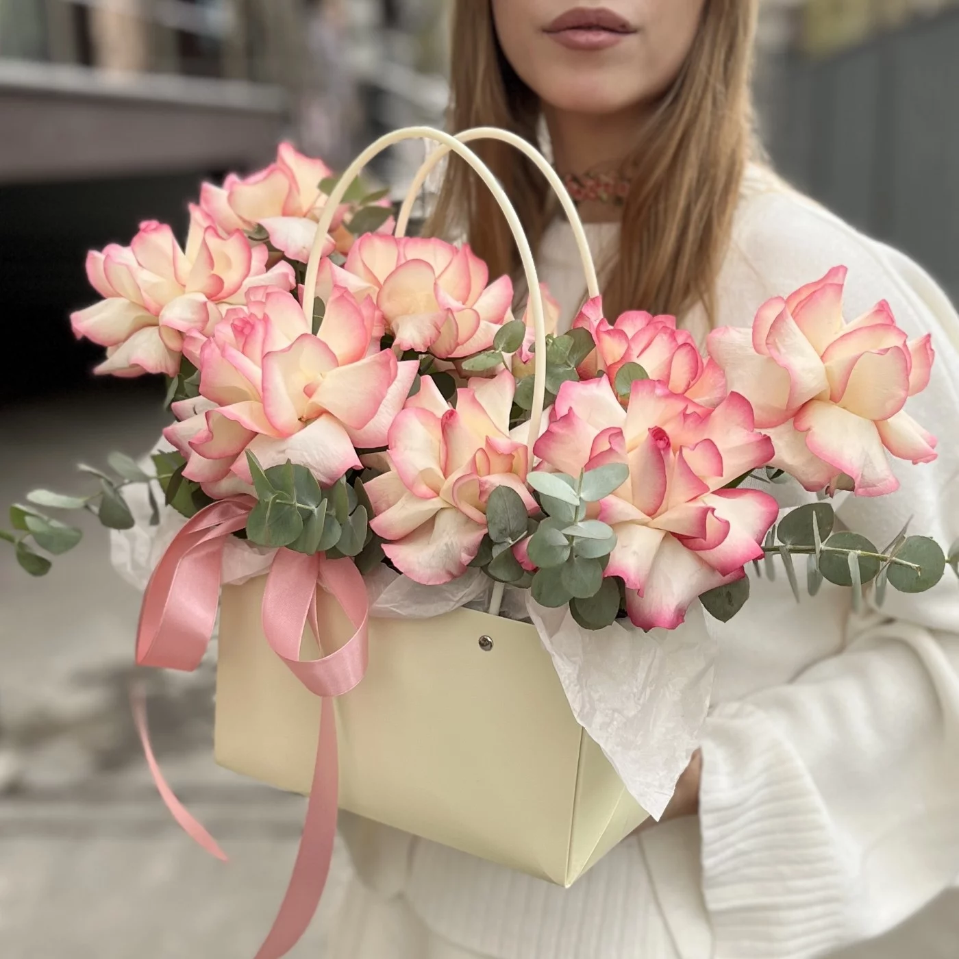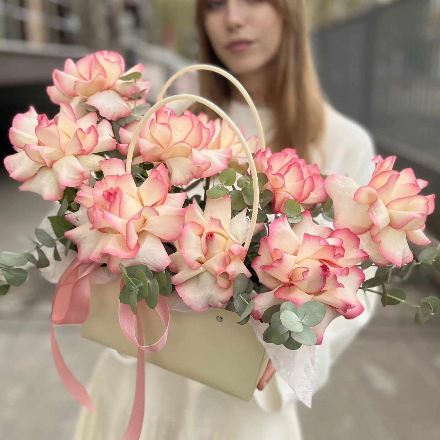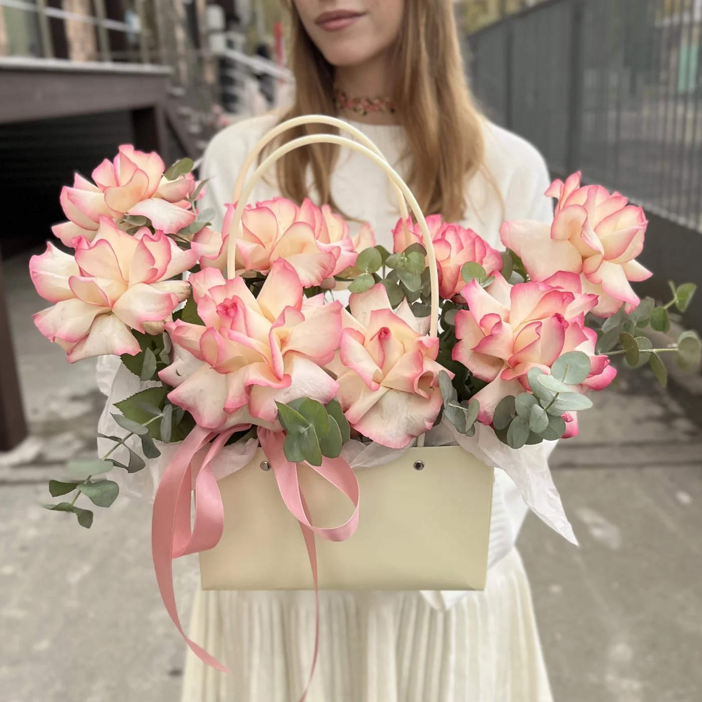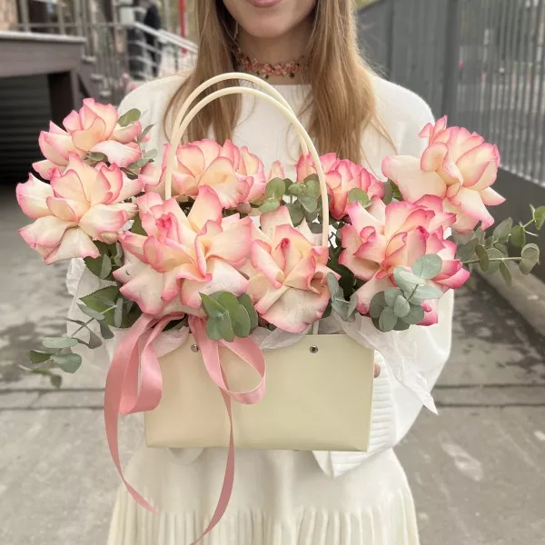 Букет из девяти пышных французских роз Джумилия, оформленный в изящной сумочке, — это настоящий акцент утончённости и стиля. Светло-розовые бутоны с нежными градиентными оттенками выглядят особенно выразительно в таком формате: сумочка подчёркивает их воздушность, делает композицию современной, аккуратной и по-настоящему уникальной. Каждая роза раскрывается плавно, создавая ощущение лёгкости и внутреннего сияния, благодаря чему букет выглядит совершенным и приносит искреннюю радость. Эта композиция станет прекрасным подарком для любимой женщины, подруги, мамы или коллеги. Она уместна для дня рождения, романтического жеста, поздравления с важным событием или просто чтобы сделать момент светлее. Мы осуществляем доставку по Москве и области круглосуточно, гарантируем отличное качество и свежесть цветов. У нас лучшие цены и великолепные отзывы покупателей во всех поисковиках, ведь каждый букет создаётся с заботой и вдохновением.