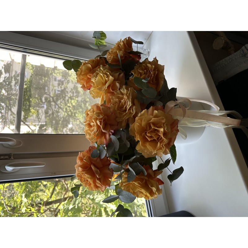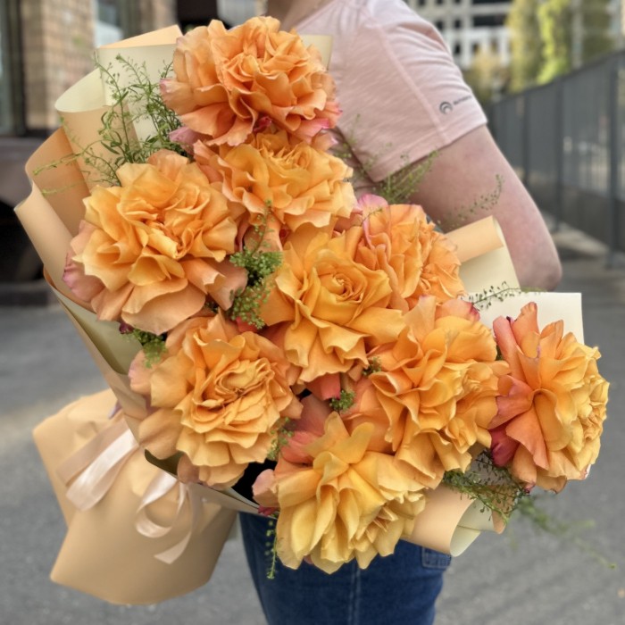 Эти розы отличаются крупными бутонами и красивым оранжевым оттенком. Такой букет подойдёт для любого случая — от романтического свидания до юбилея.