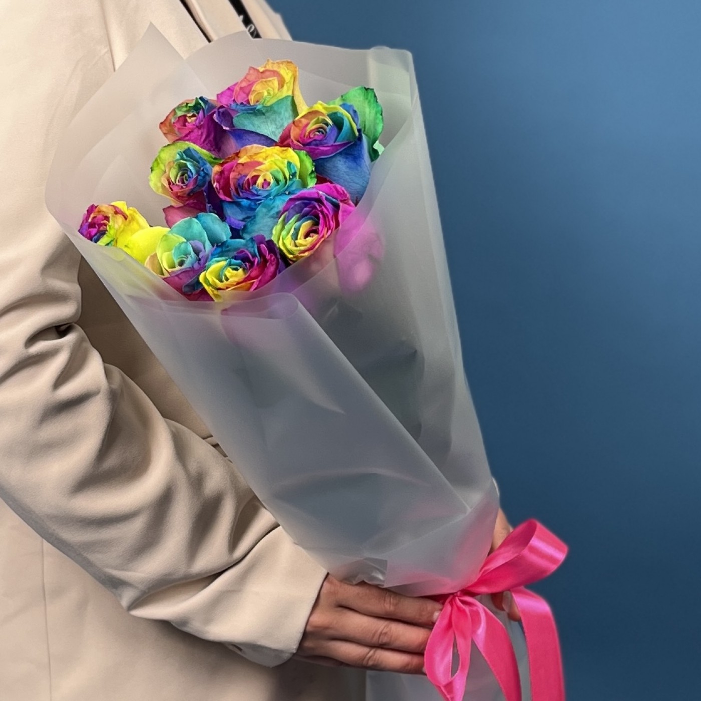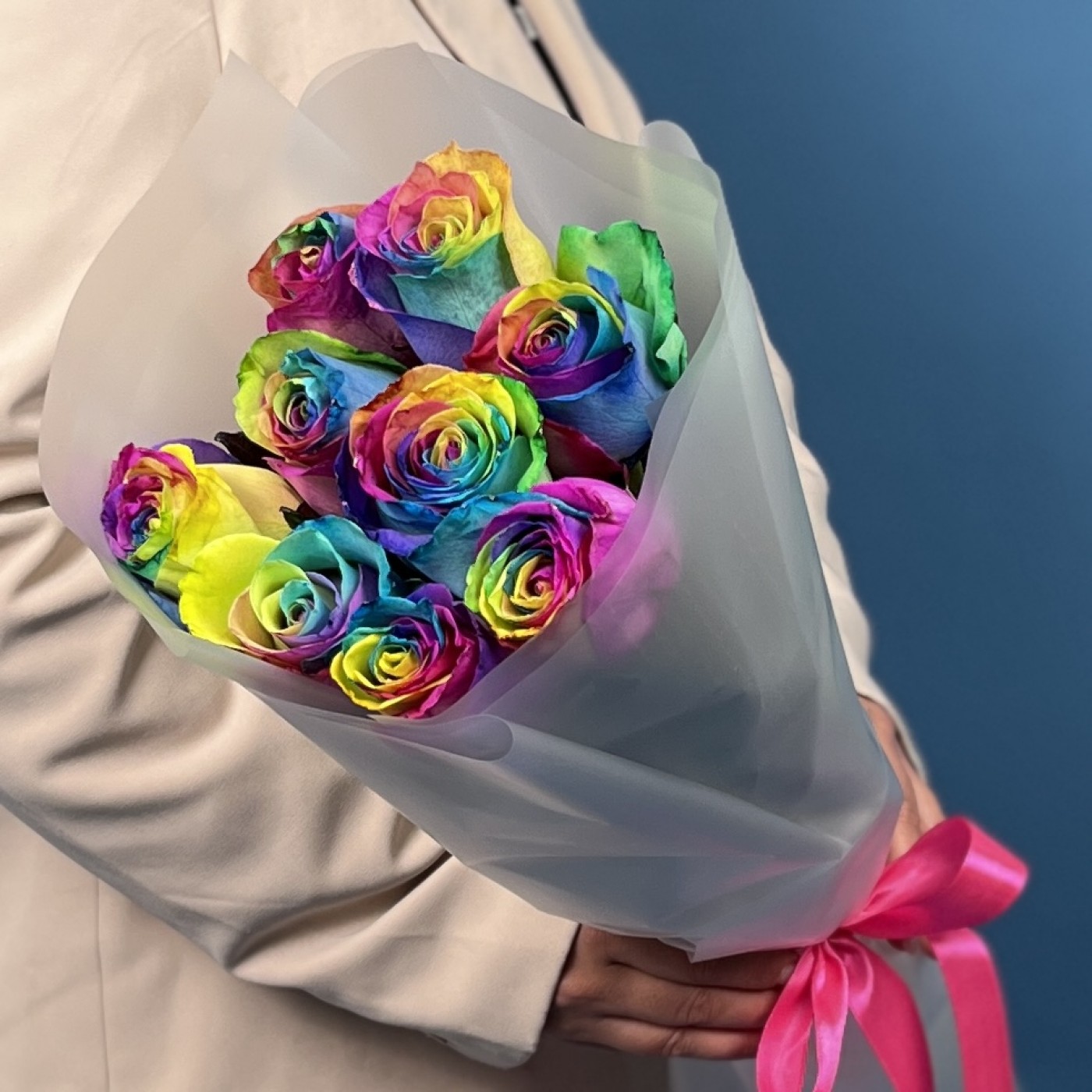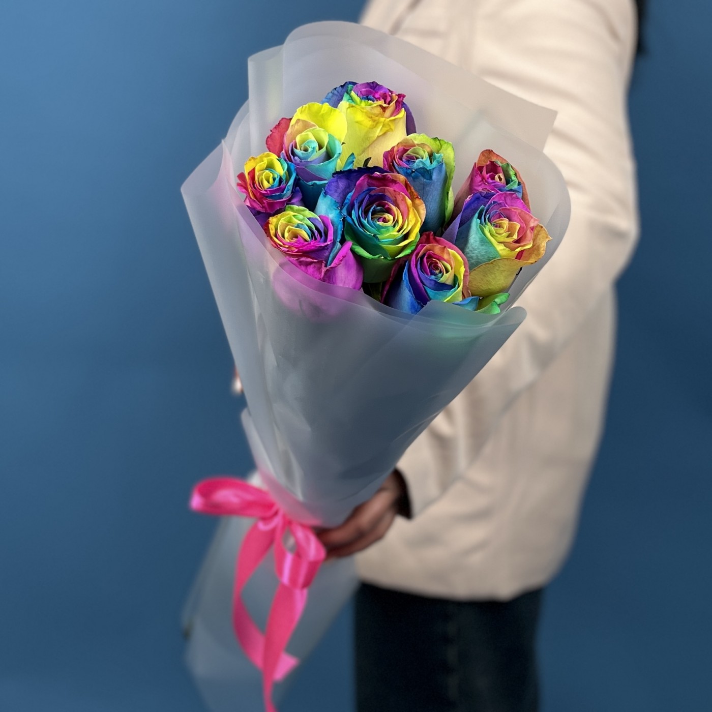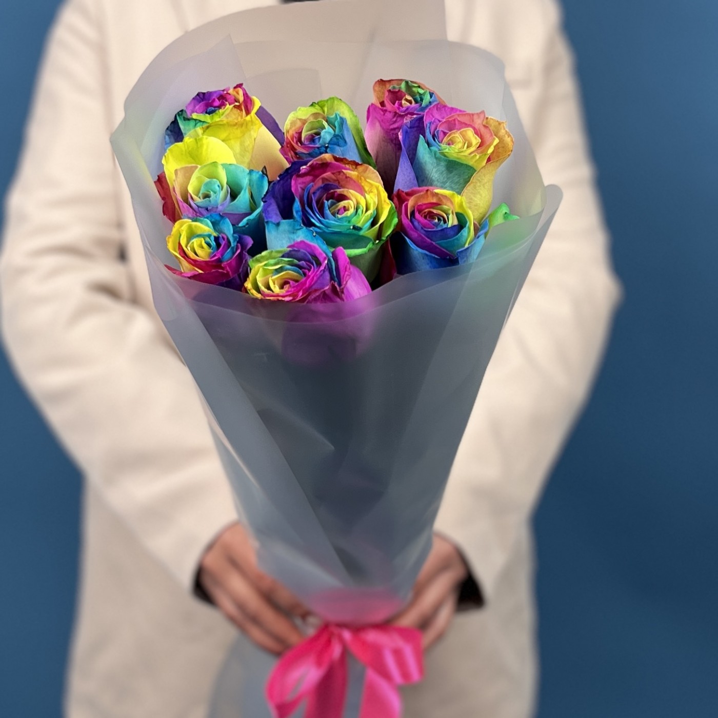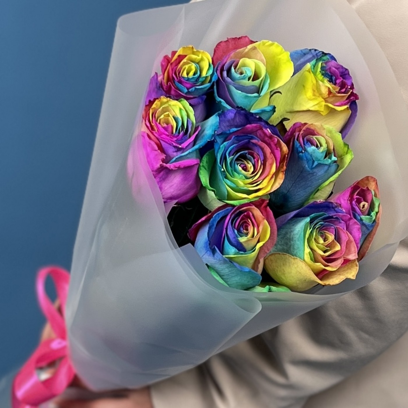 Этот яркий и насыщенный букет состоит из 9 удивительных радужных роз с длиной стебля 60 см. Каждая роза — настоящее произведение искусства, с лепестками, переливающимися всеми цветами радуги. Такой необычный подарок подчеркнет вашу индивидуальность и создаст атмосферу веселья, радости и праздника. Идеальный выбор для тех, кто любит яркие эмоции и нестандартные решения.