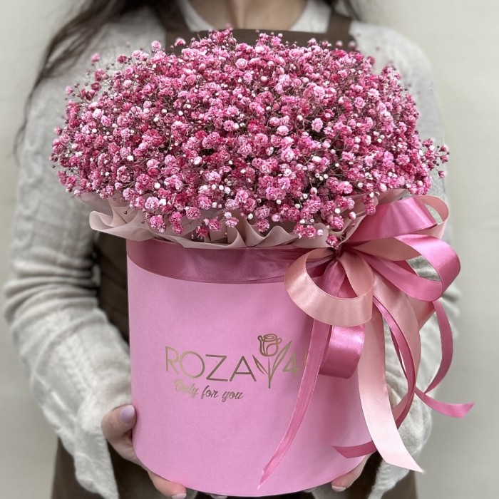 Композиция из 9 розовых гипсофил в коробке — это нежное и романтичное оформление, которое прекрасно подойдет для различных случаев, включая дни рождения, поздравления или просто как знак внимания.