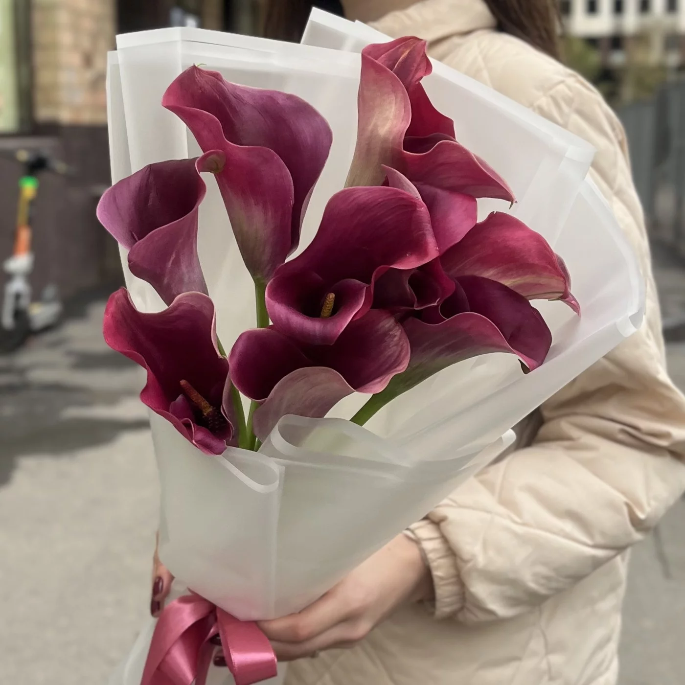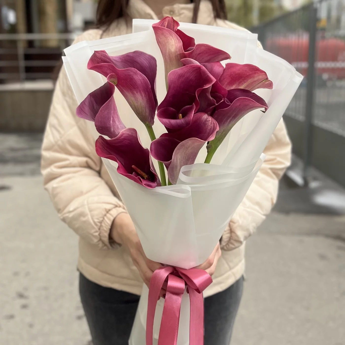 Букет из 9 ярких калл розового оттенка смотрится очень изящно и лаконично. Каллы можно преподнести в качестве подарка или заказать, чтобы украсить интерьер Вашего дома или офиса.