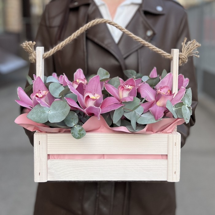 Букет состоит из 9 розовых орхидей, аккуратно размещенных в элегантном деревянном ящике. Каждая орхидея отличается изящной формой, нежным розовым оттенком и утонченным внешним видом, создавая стильную и романтичную композицию. Такой букет станет прекрасным подарком для особых случаев, выражая искренние чувства и добавляя нотки элегантности и утонченности. Натуральный деревянный ящик подчеркивает природную красоту цветов и придает композиции особый шарм.