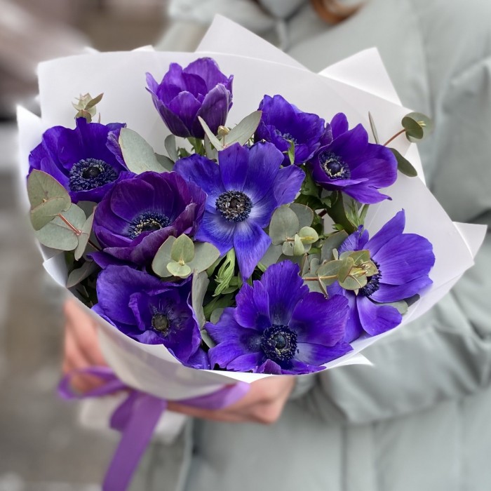 Букет из синих Анемонов. Прекрасный подарок на день рождения. Этот цветок очень нежный и воздушный. Его бутон напоминает разноцветные маки. Удиви получателя необычными цветами.