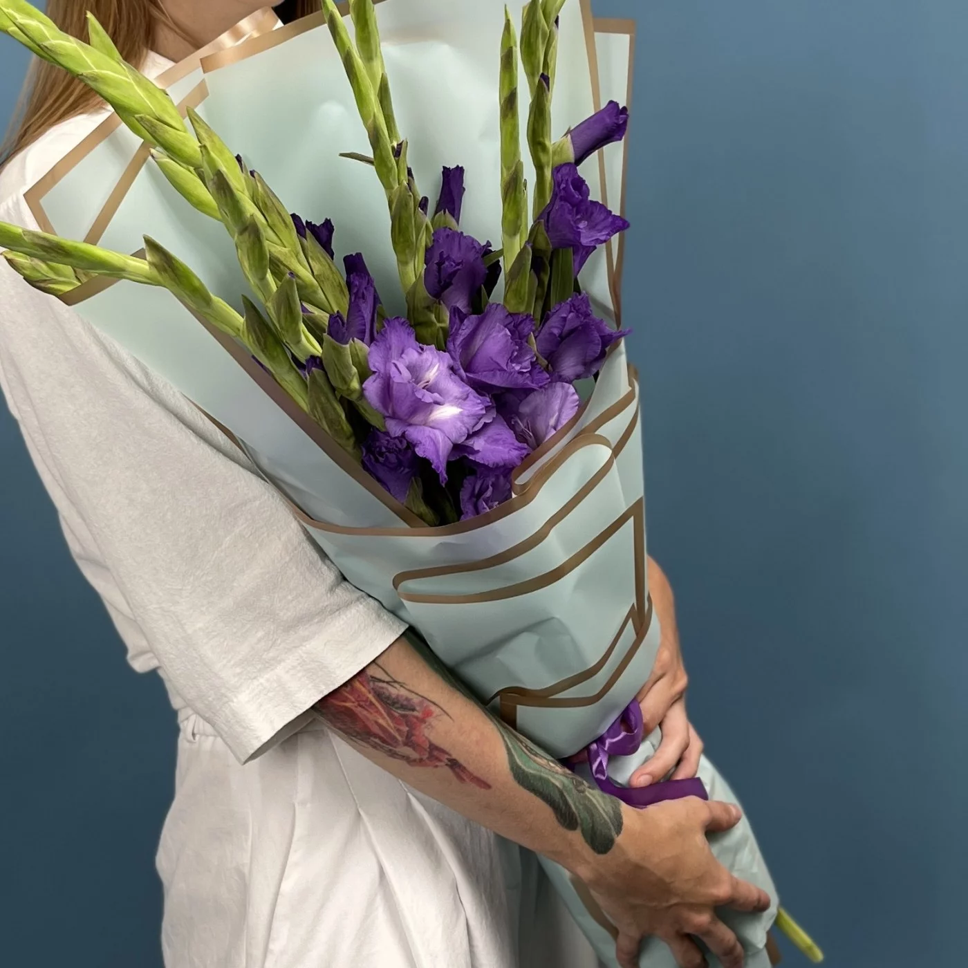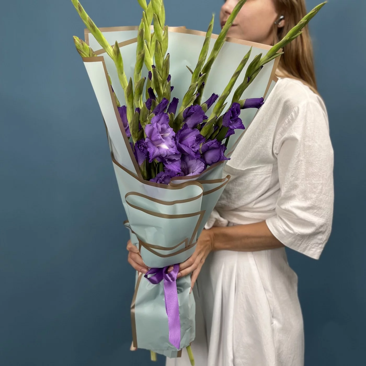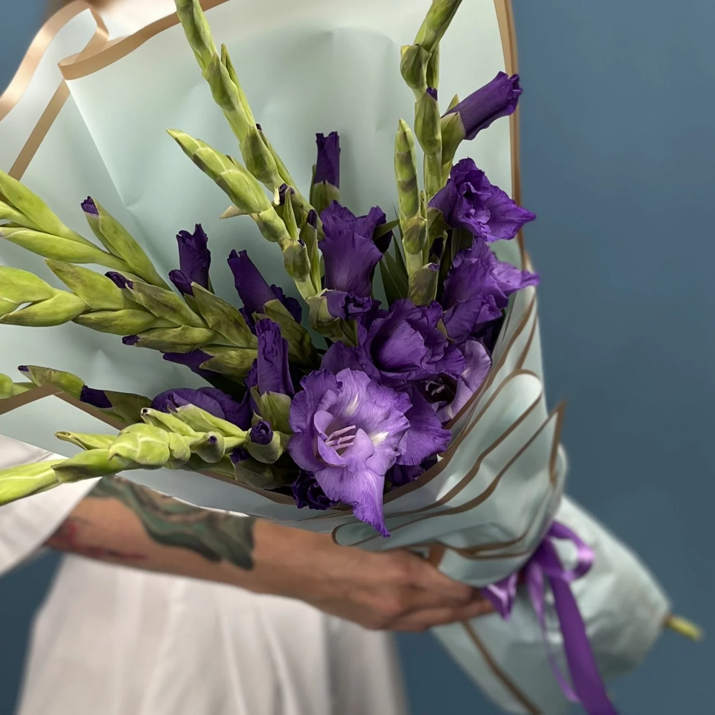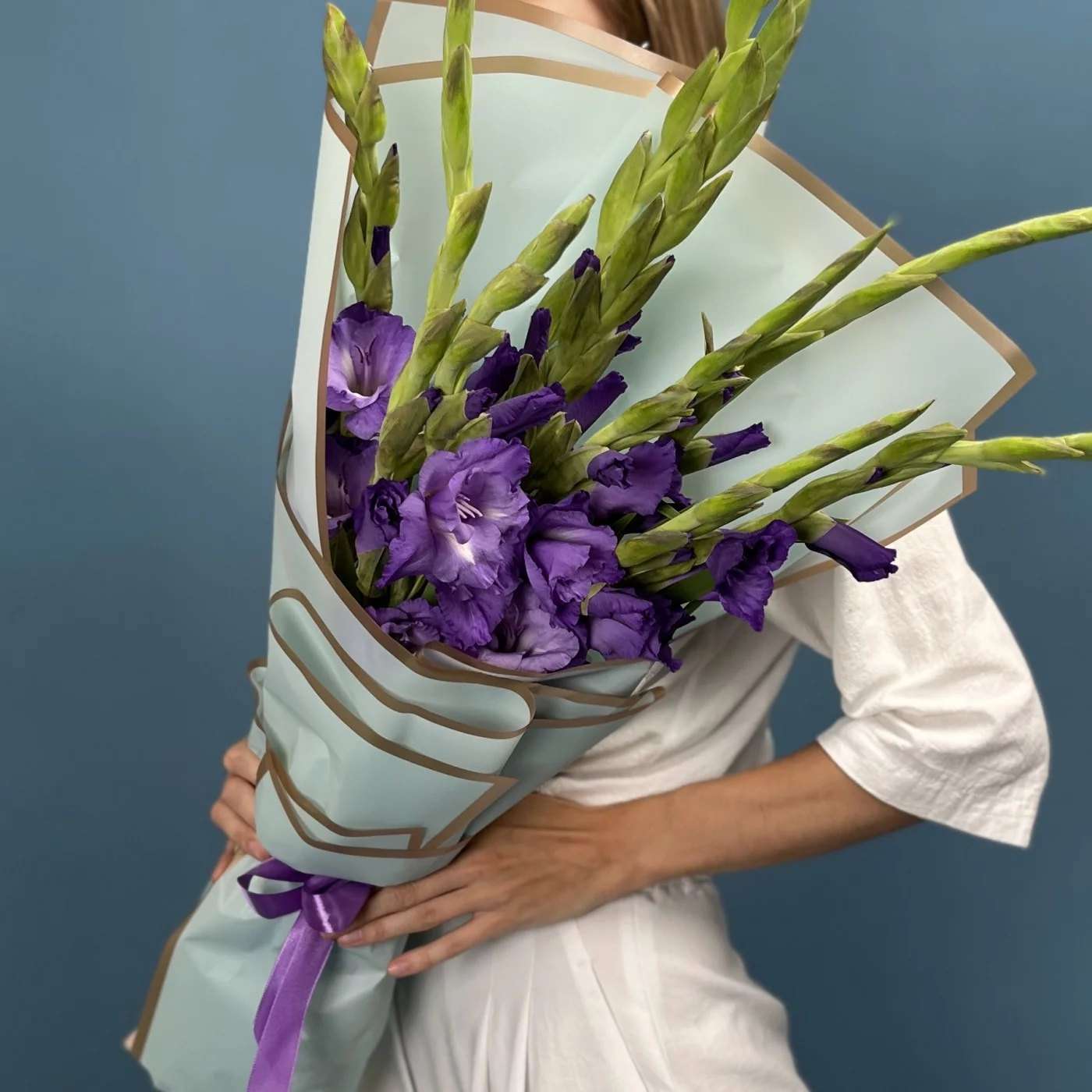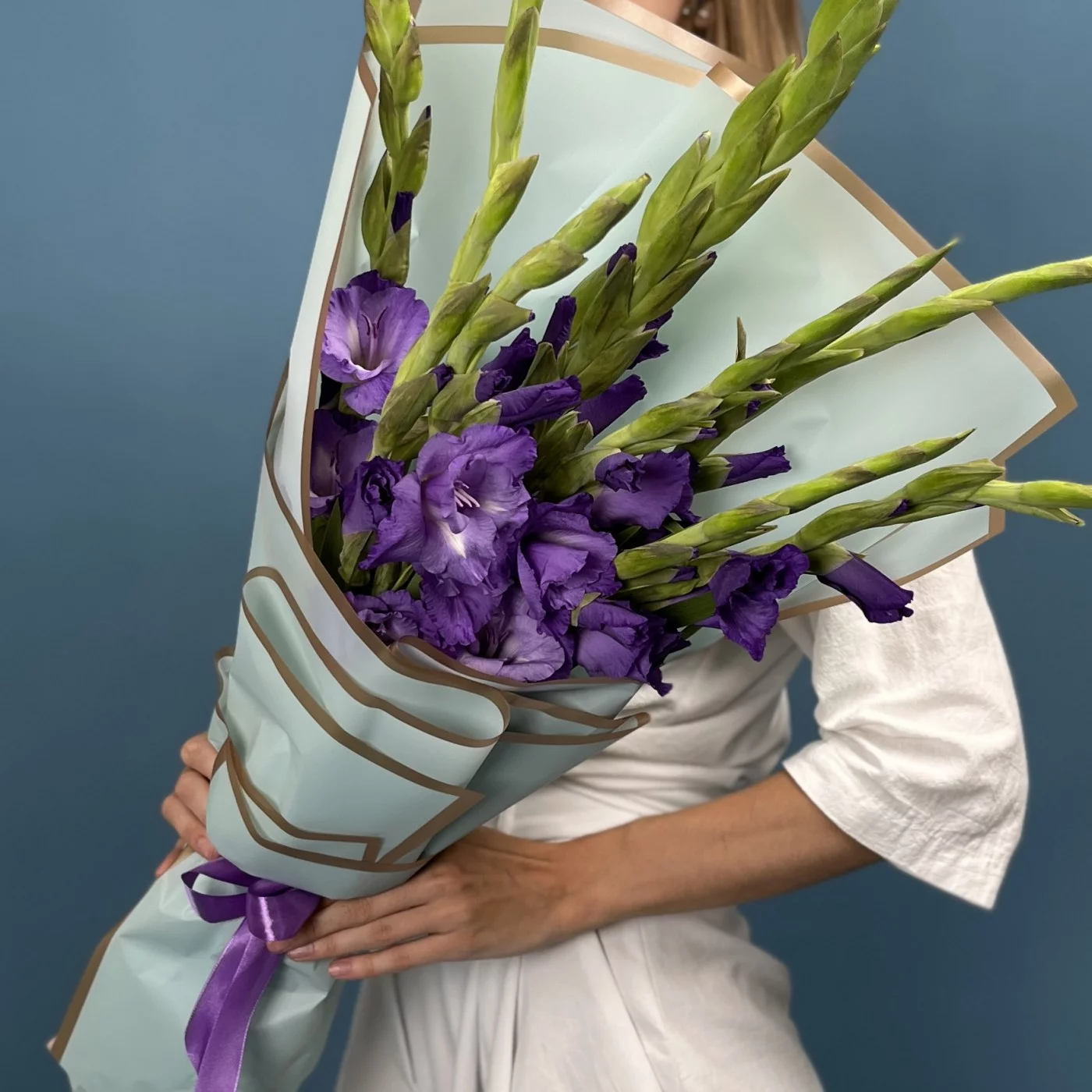 9 темно-фиолетовых гладиолусов — это символ утонченности и глубокой красоты. Их насыщенный фиолетовый оттенок придает композиции особую элегантность и выразительность.