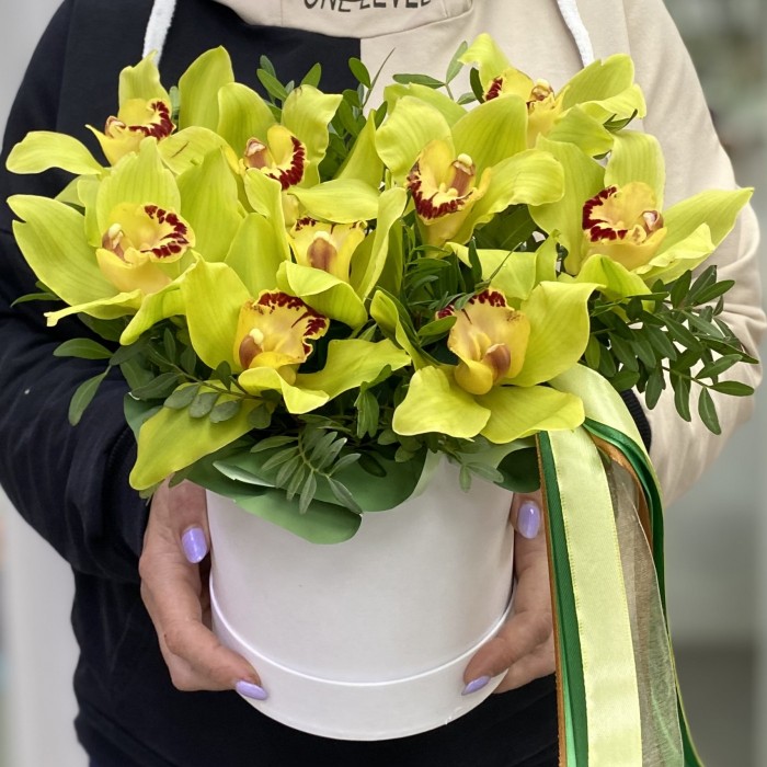 Этот букет станет идеальным подарком для самых разнообразных случаев. Его можно преподнести на день рождения, юбилей, свадьбу или любое другое значимое событие. Букет из зеленых орхидей Цимбидиум подойдет для мамы, сестры, подруги или коллеги, выражая вашу искреннюю заботу и восхищение. Белая шляпная коробка с аккуратной лентой подчеркивает элегантность композиции и придает ей завершенный вид, делая букет поистине роскошным подарком.