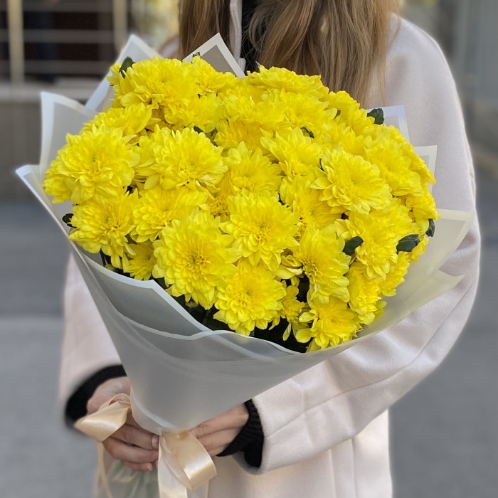Букет из 9 желтых кустовых хризантем сорта «Балтика» — это элегантная и яркая композиция, способная украсить любое событие или стать изысканным подарком.
