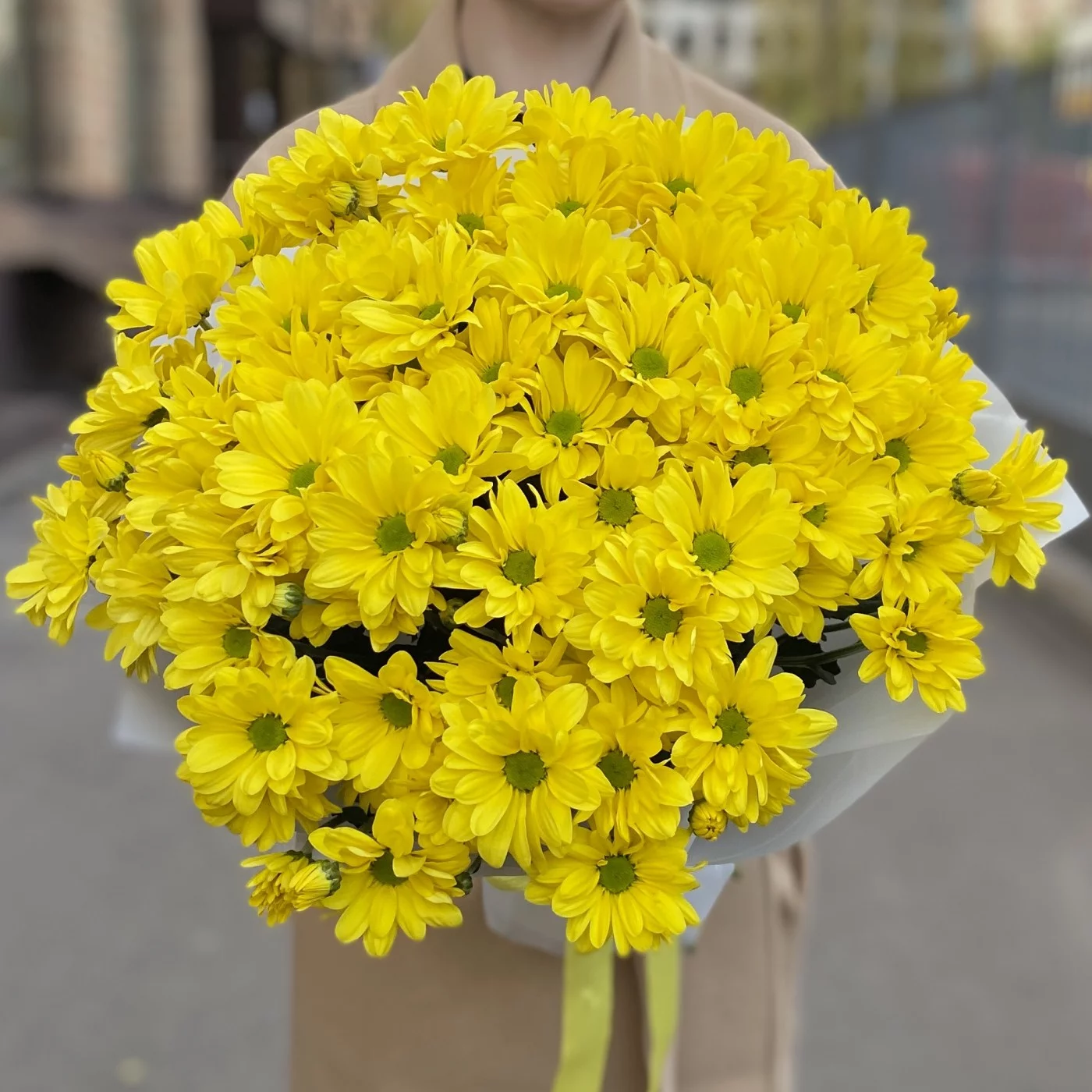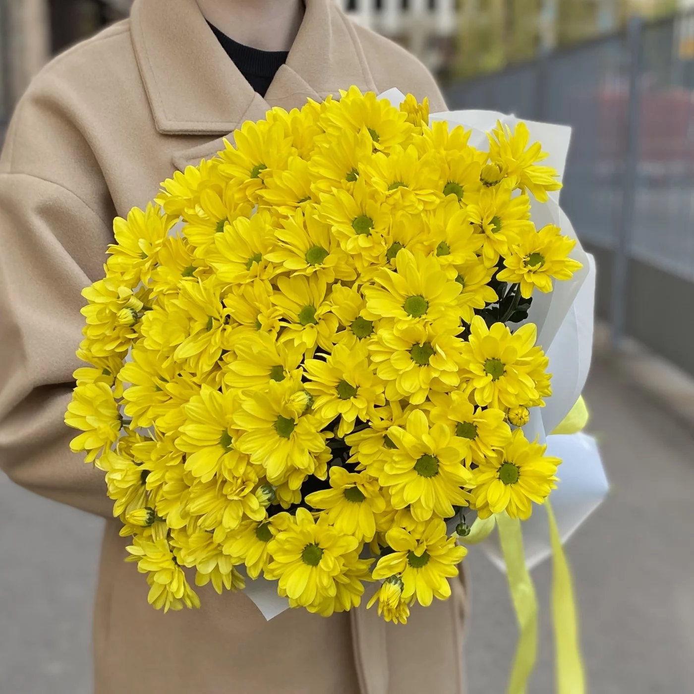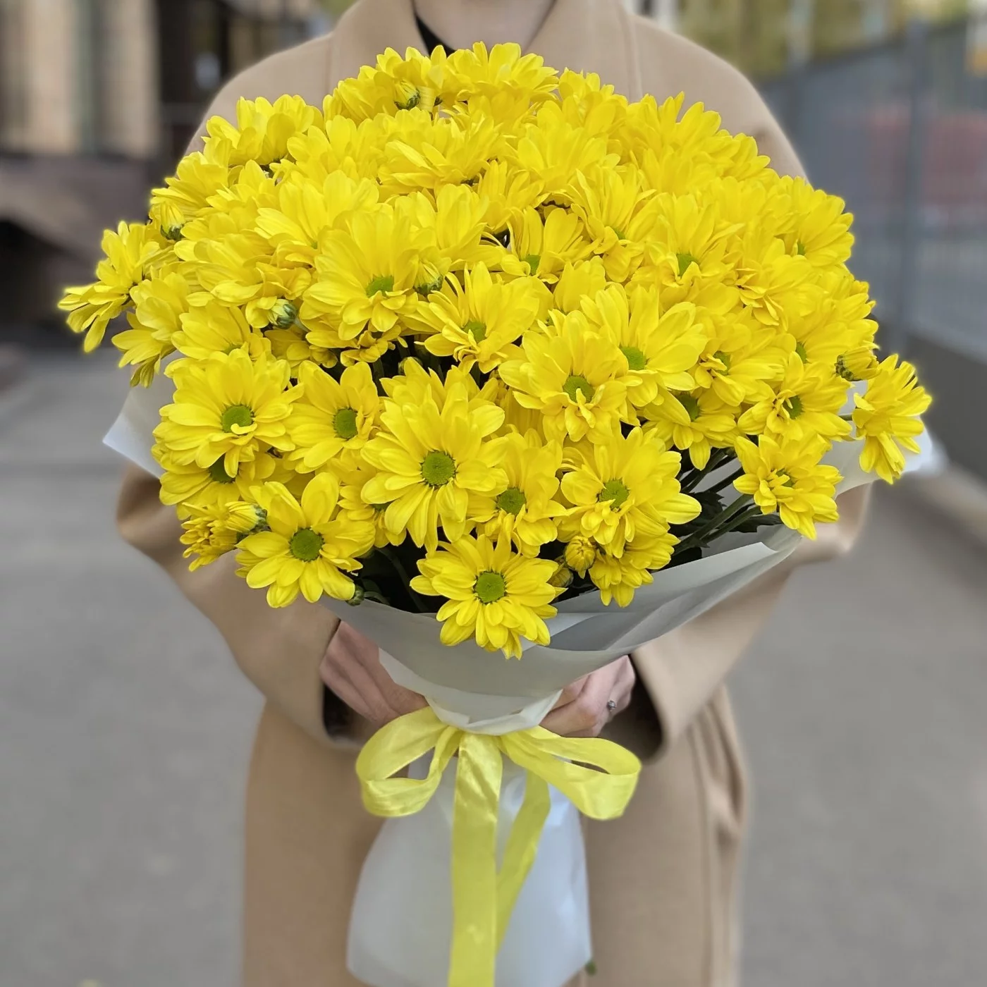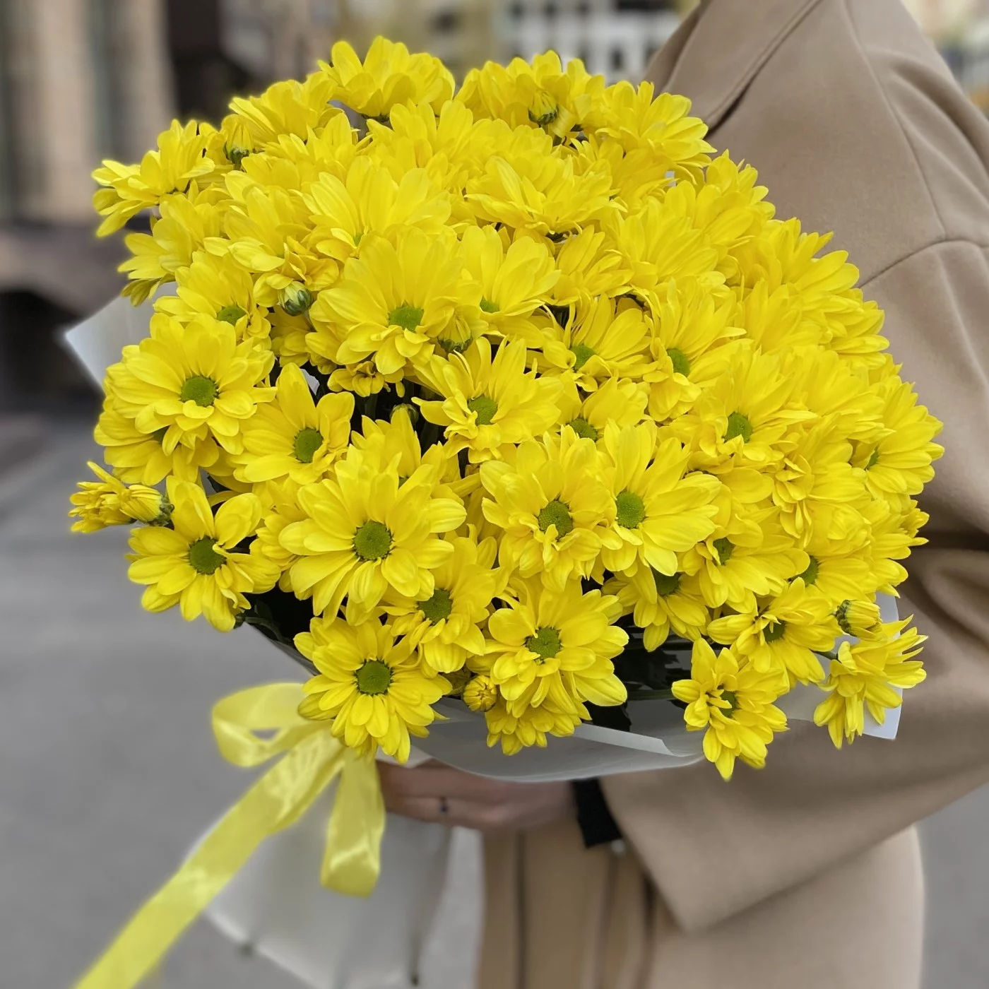 Букет из 9 желтых кустовых хризантем сорта Бакарди — это яркая и жизнеутверждающая композиция, которая будет привлекать внимание своей красотой и насыщенными цветами. Хризантемы этого сорта отличаются крупными соцветиями яркого желтого и сиреневого цвета, символизирующего радость и оптимизм.