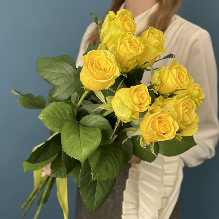 Изящный букет из 9 роз сорта Хай Еллоу длиной 60 см — это воплощение солнечного света и радости.