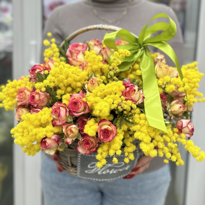 Ароматная мимоза с кустовыми розами в корзине
