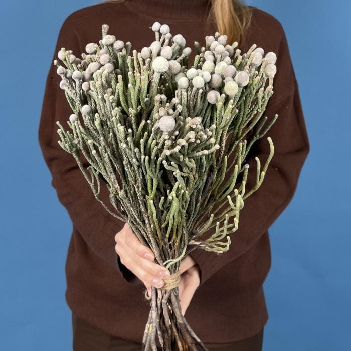 Благодаря декоративной текстуре, бруния становится популярным элементом в букетах для праздничных и торжественных событий. Она хорошо сочетается с другими цветами, создавая яркие и живые композиции.