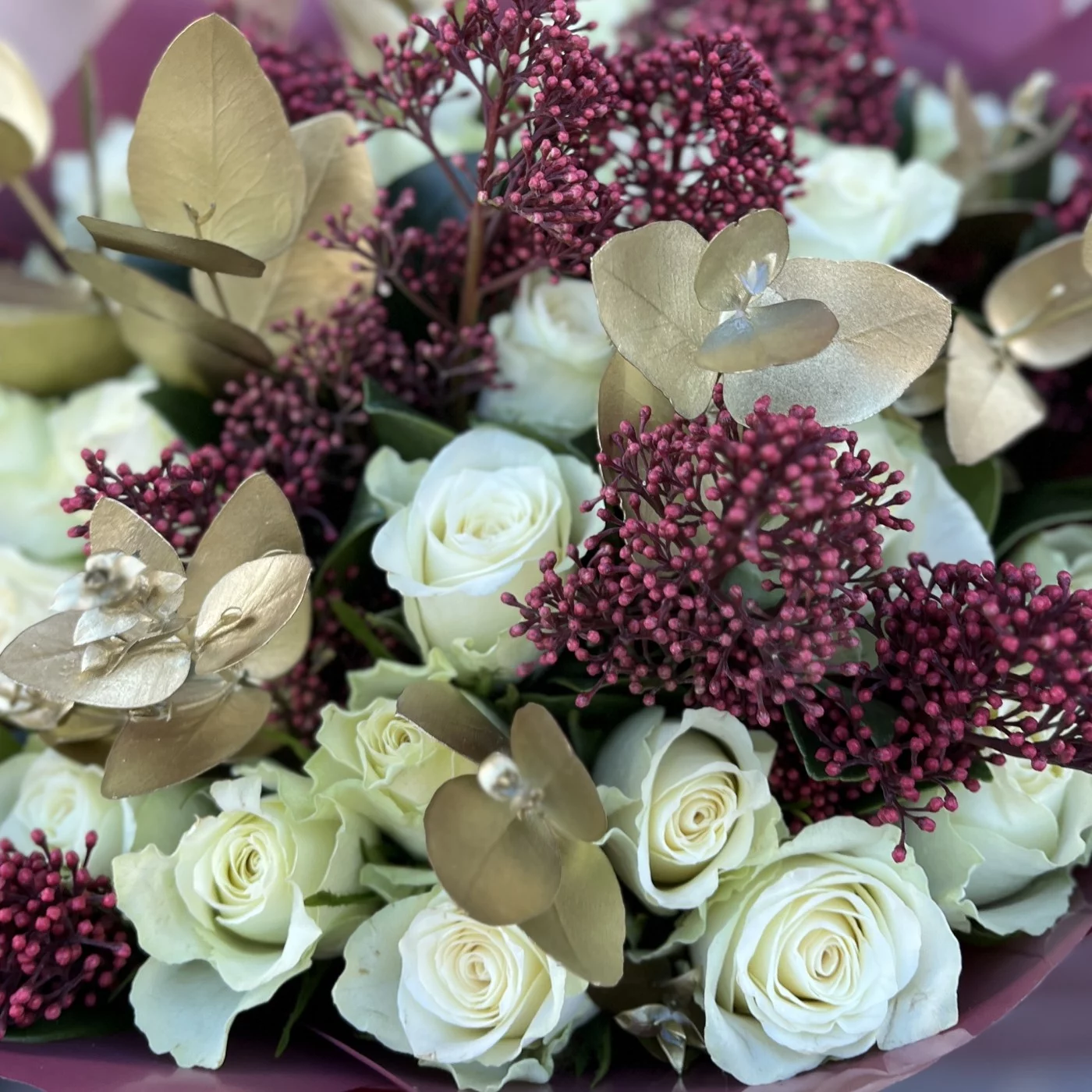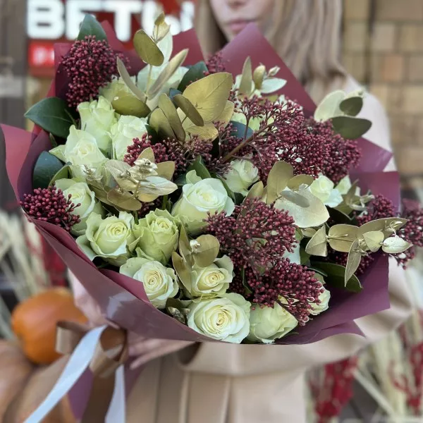 Букет на юбилей из роз и астранции – это элегантная и стильная композиция, которая прекрасно подходит для торжества и подчеркивает значимость события.