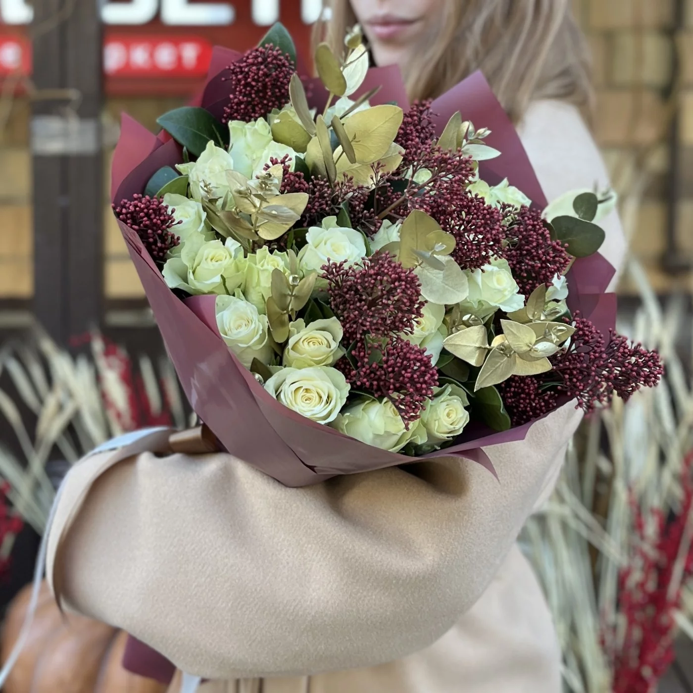 Букет из роз и скинии на юбилей