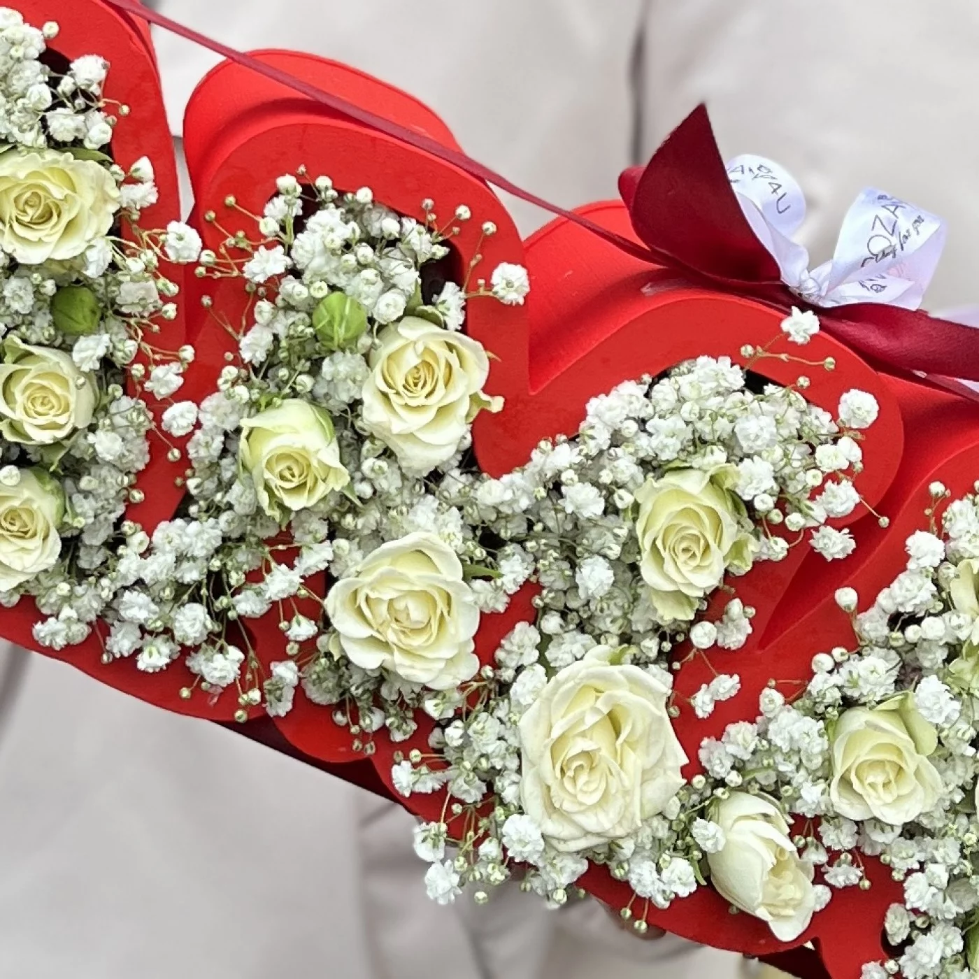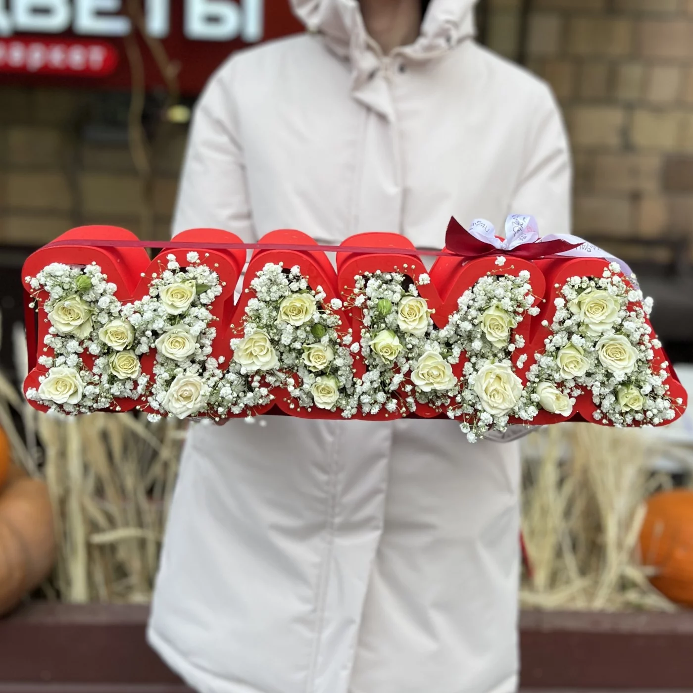 Коробка в виде надписи Мама с белыми гипсофилами и белыми кустовыми розами, станет очень приятным подарком для вашей мамочки. Композицию актуально подарить на день матери или день рождения.