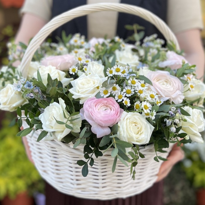 Нежные Ранункулюсов в корзине с ромашками, представляют собой очаровательное и романтичное сочетание, которое идеально подходит для создания светлой и радостной атмосферы.