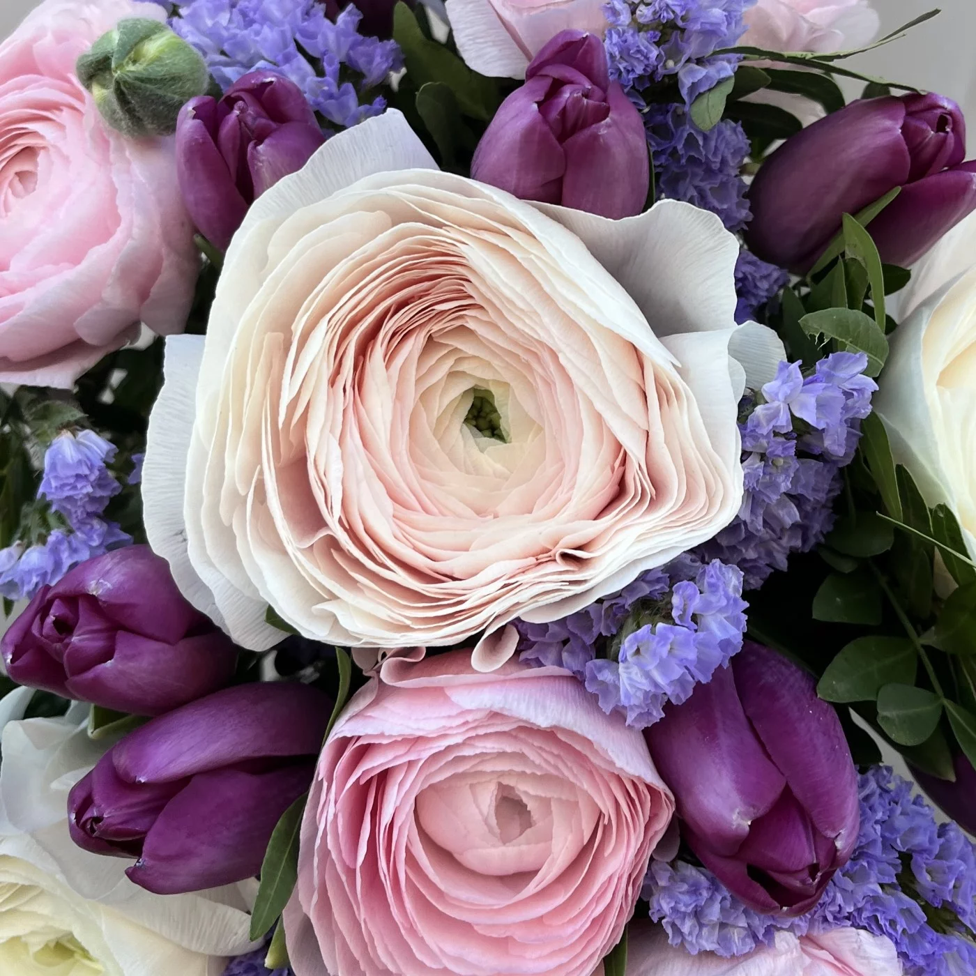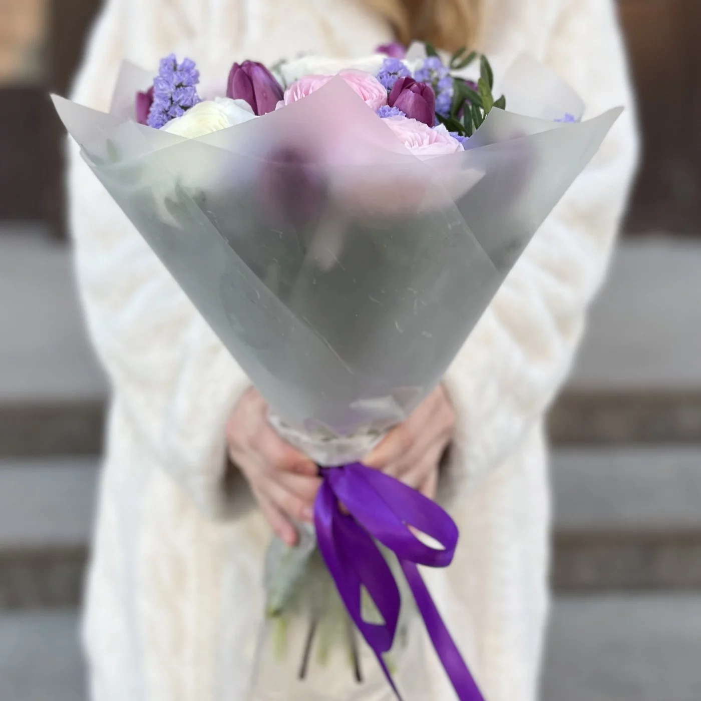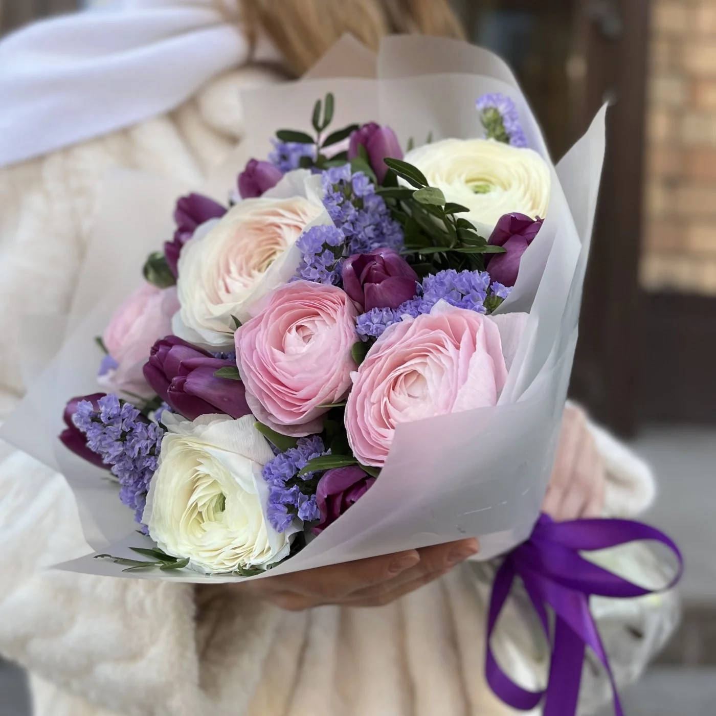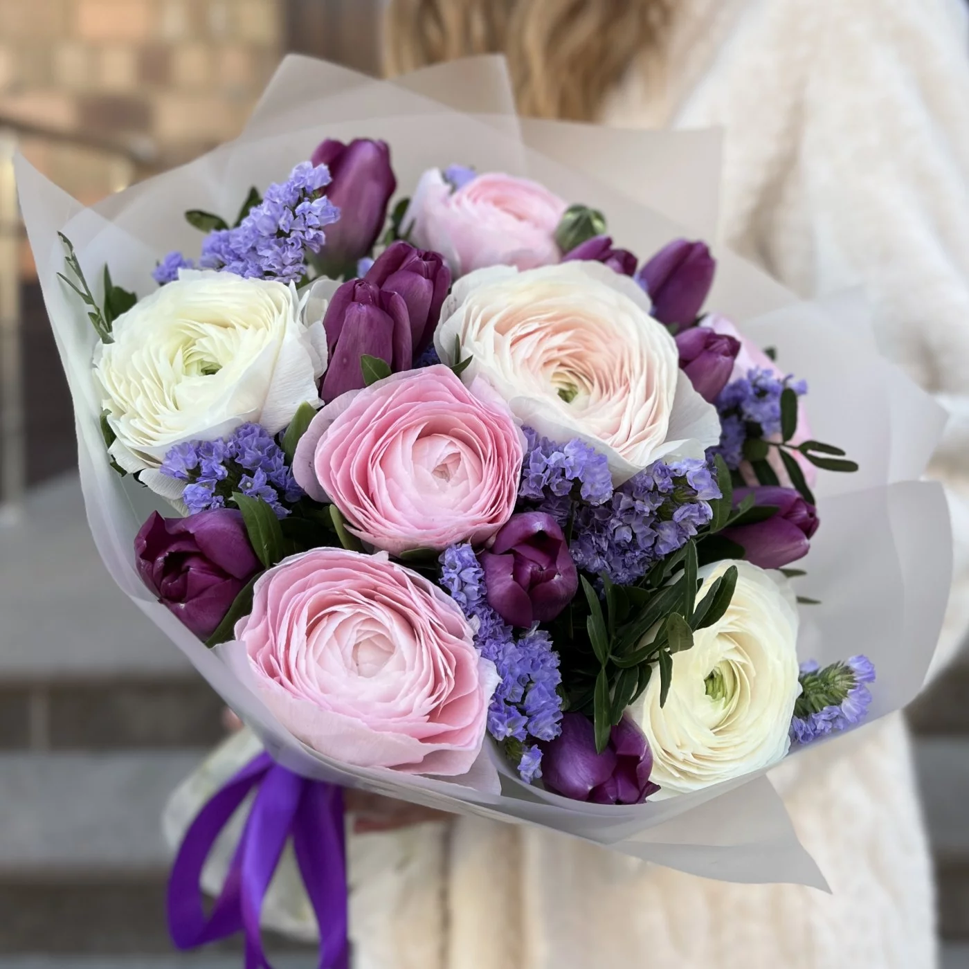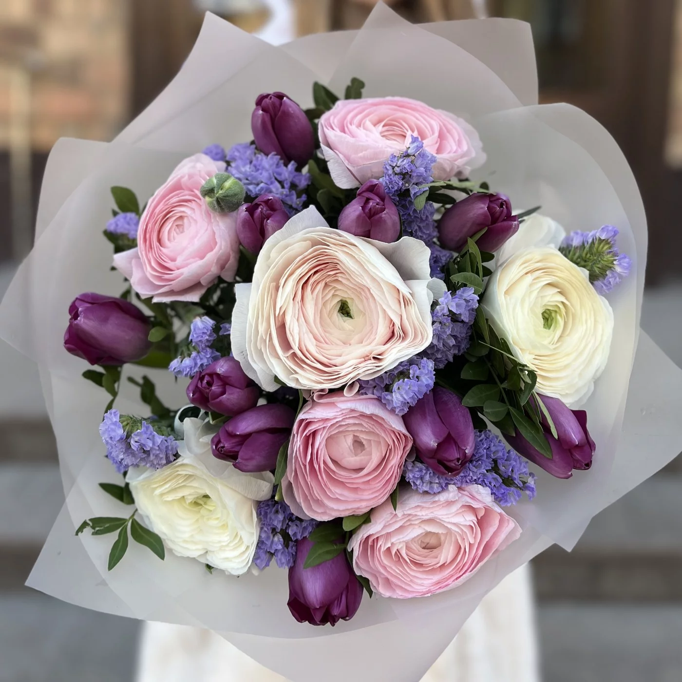 Букет из тюльпанов и ранункулюсов — это изысканная и нежная композиция, которая сочетает в себе яркость и утонченность.