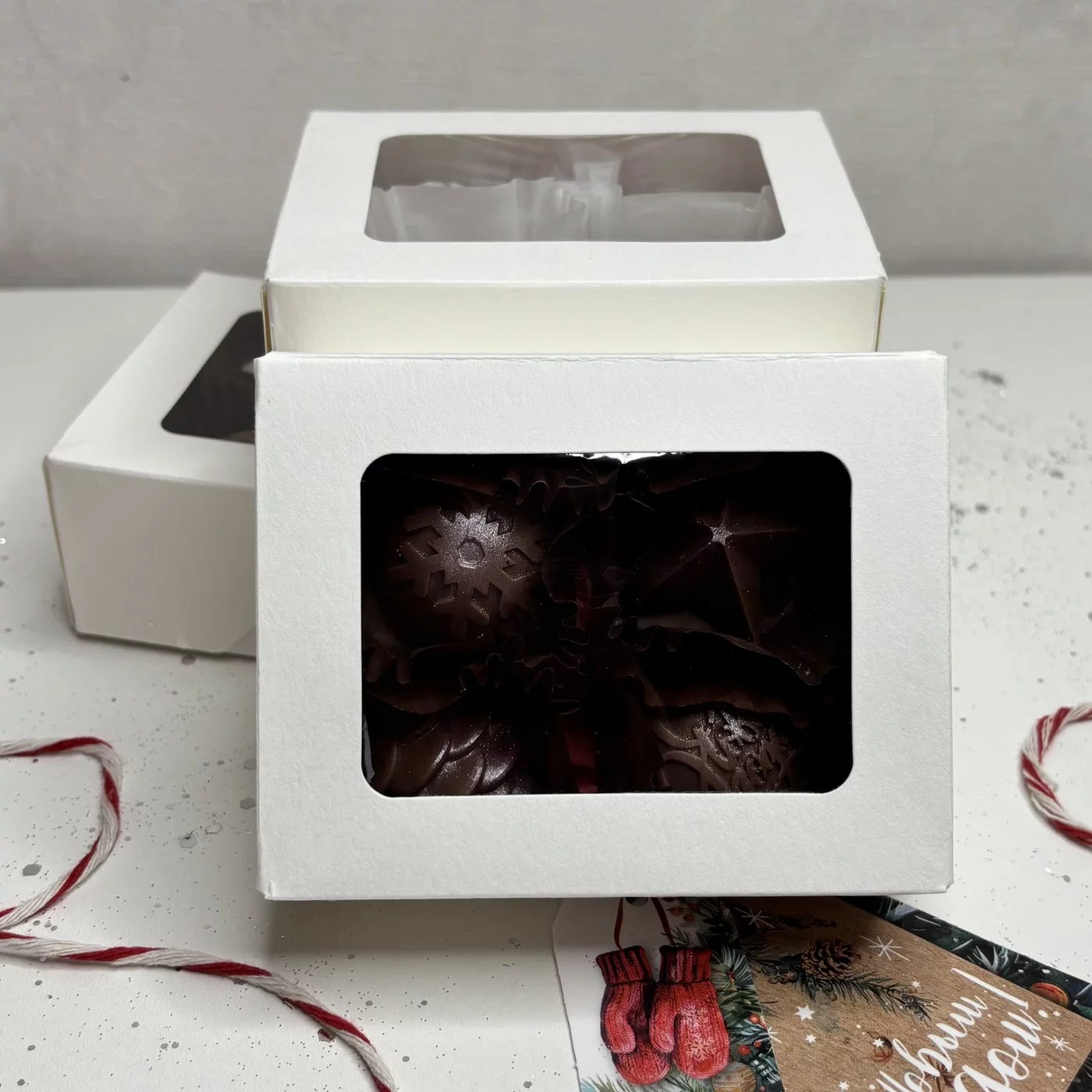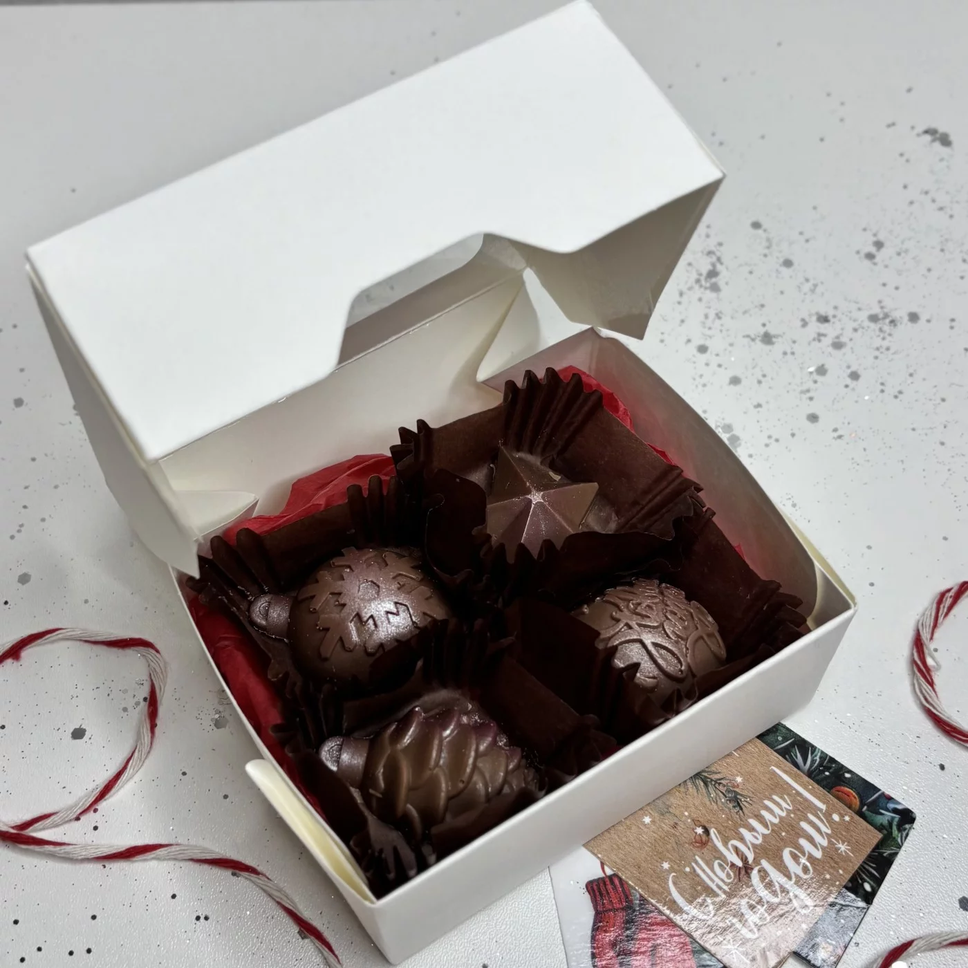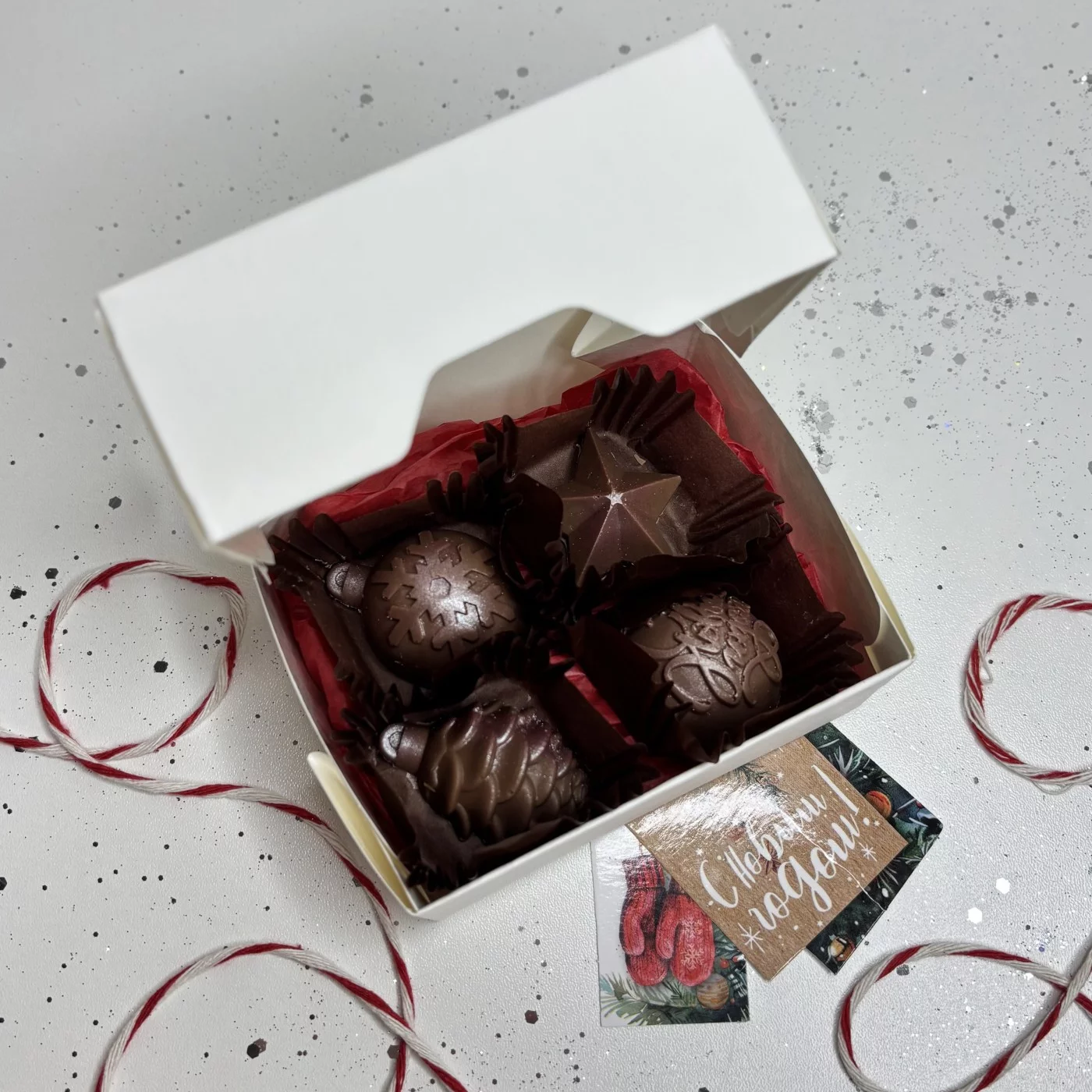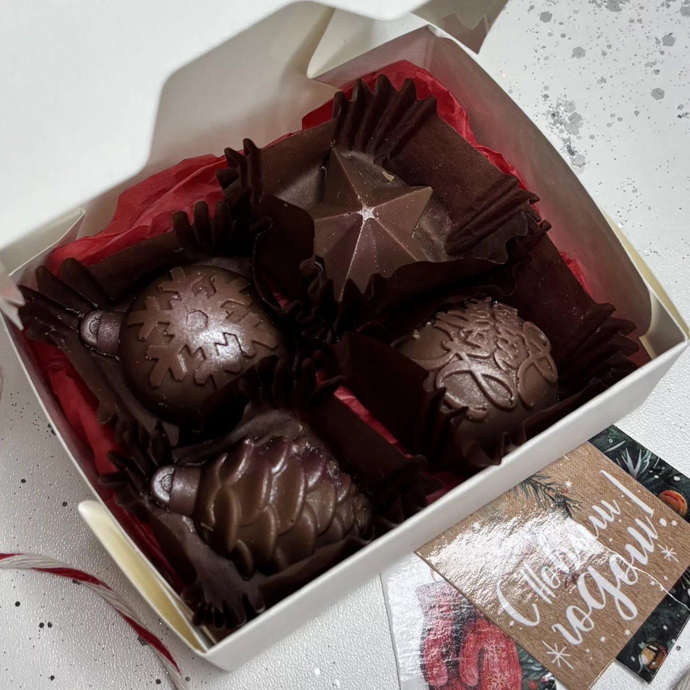 Шоколад ручной работы в виде елочных украшений. Такой набор прекрасно подойдет в качестве подарка любимым и коллегам. Все делается вручную и под заказ! Количество заказов ограничено. Если на шоколаде образовался белый налет, это не значит что он испортился! Мы делаем нашу продукцию из натурального шоколада в котором содержится большое количество какао масла. После того как шоколад проходит темперирование, масло выделяется поверх шоколада довольно быстро. Поэтому не сравнивайте хороший шоколад ручной рабы с конфетками которые продаются в супермаркетах.