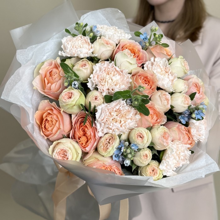 Сборный букет «Персиковый пирог» — это нежное сочетание персиковых, кремовых и белых оттенков, создающее ощущение тепла и утончённости. Лёгкие текстуры, воздушные формы и гармоничная палитра делают букет идеальным подарком для тех, кому хочется передать заботу, нежность и искренние чувства. Идеален для любого повода.