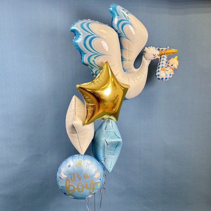 Набор шаров для мальчика Аист прилетел — это милое и символичное украшение, которое подчеркнёт важность момента и подарит радость всем присутствующим. Эта композиция станет красивым акцентом праздника и будет радовать глаз на протяжении долгого времени.