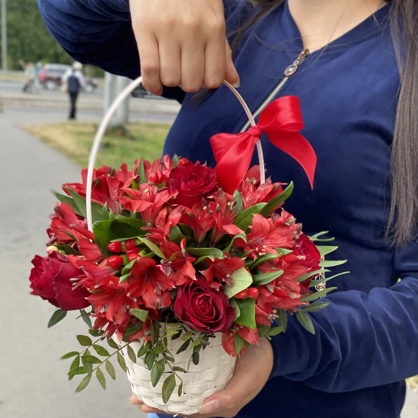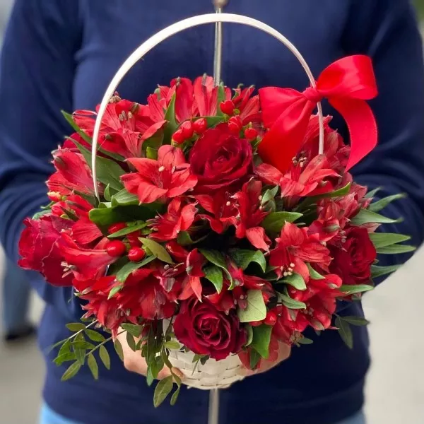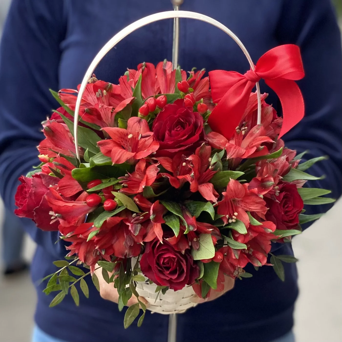 Классическая корзиночка в красных оттенках с альстромериями, розами и ягодами. Прекрасный подарок преподавателю, на день рождения ребенку или просто как небольшой комплимент. Преподнесите радостную корзиночку и порадуйте получателя.
