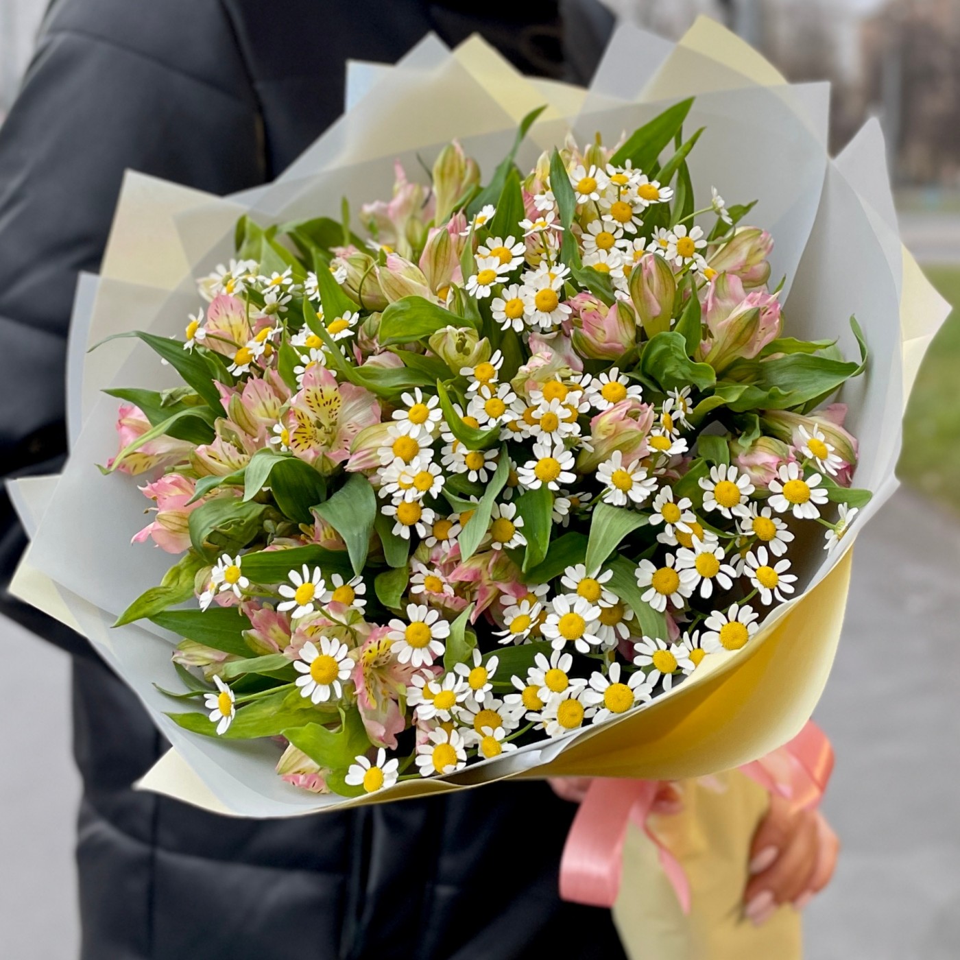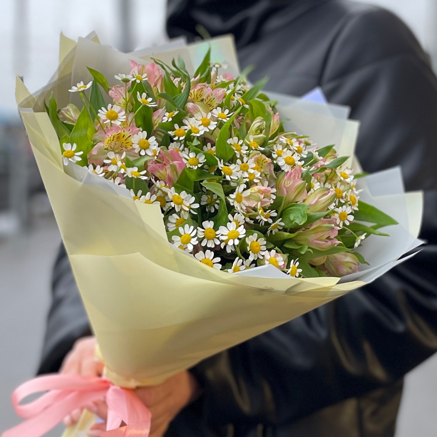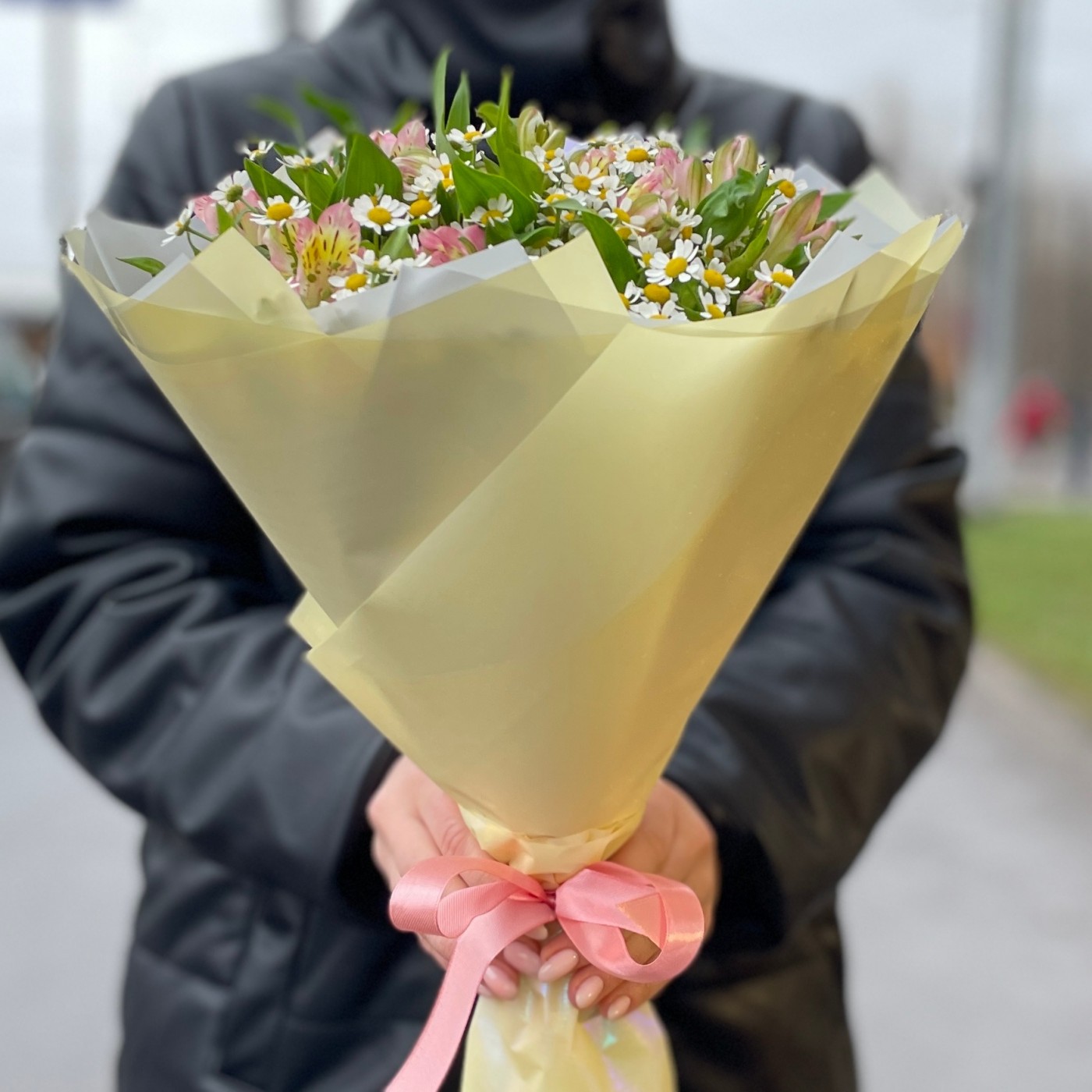 Нежный букет цветов в розово-жёлтых тонах. В состав букета входят розовые альстромерии и танацетум. Такой букет можно подарить маме в знак внимания или взять его с собой на свидание.