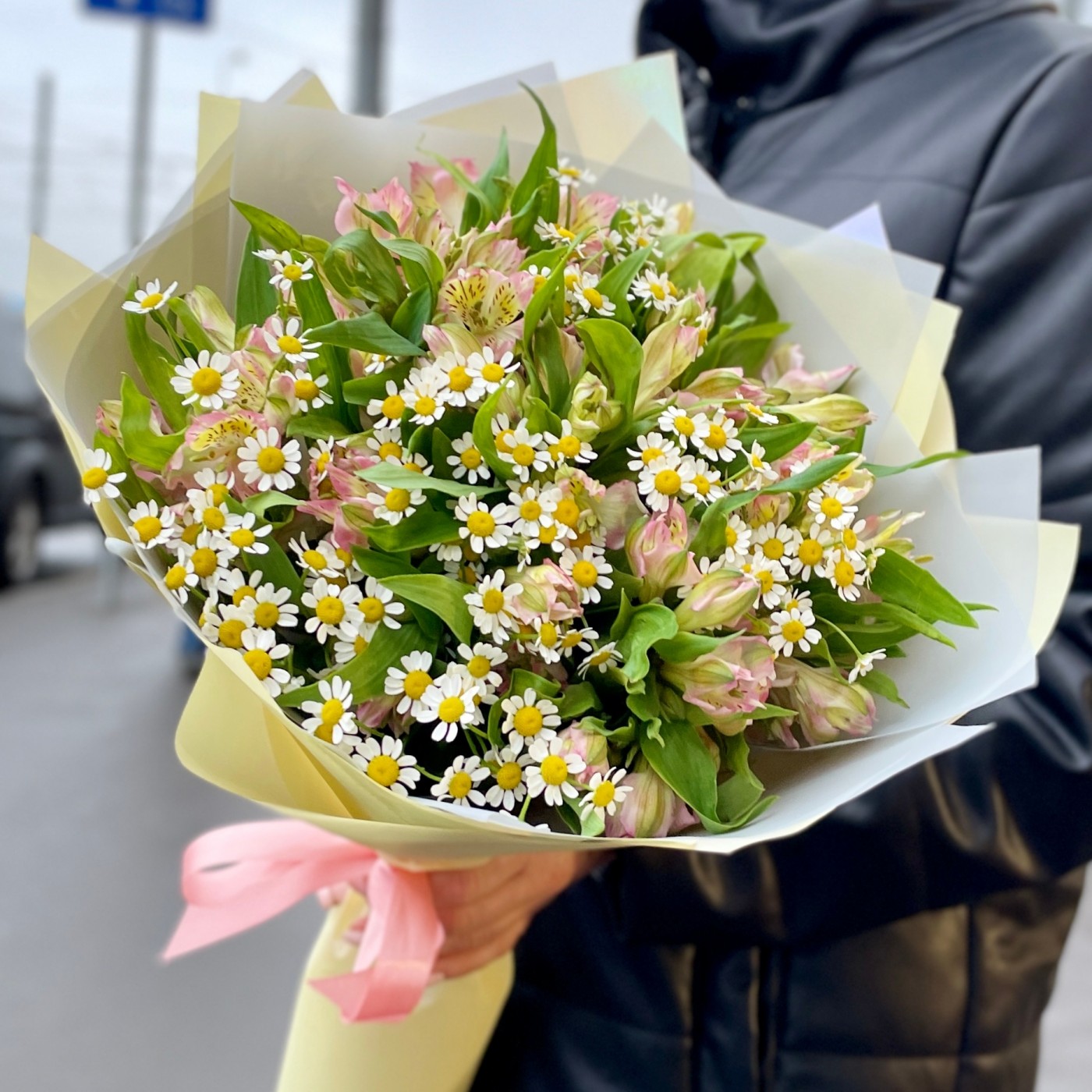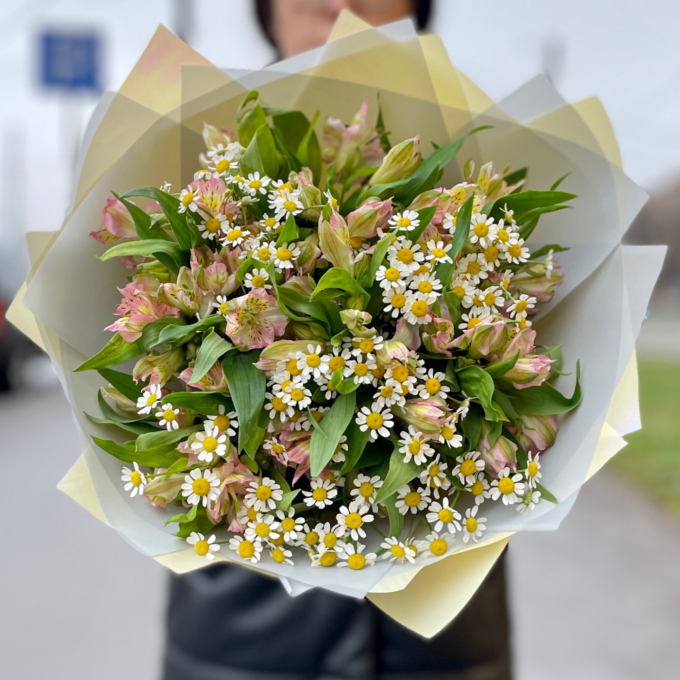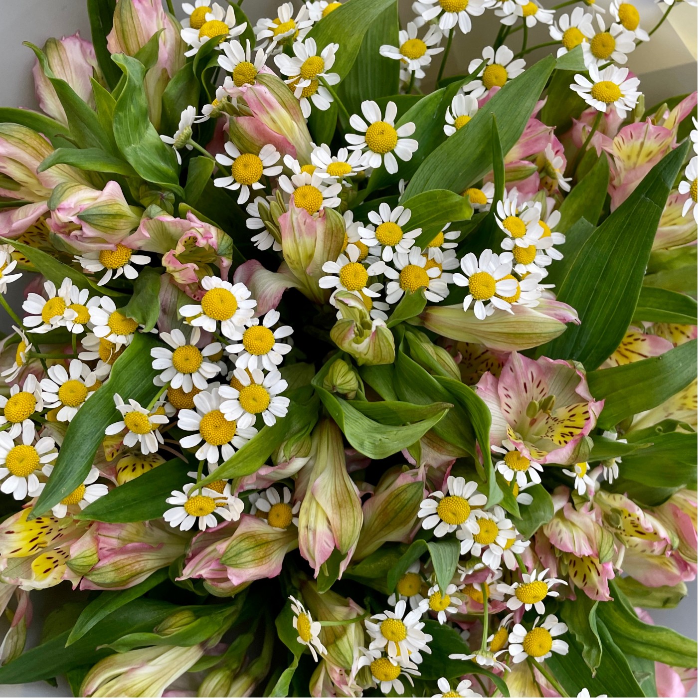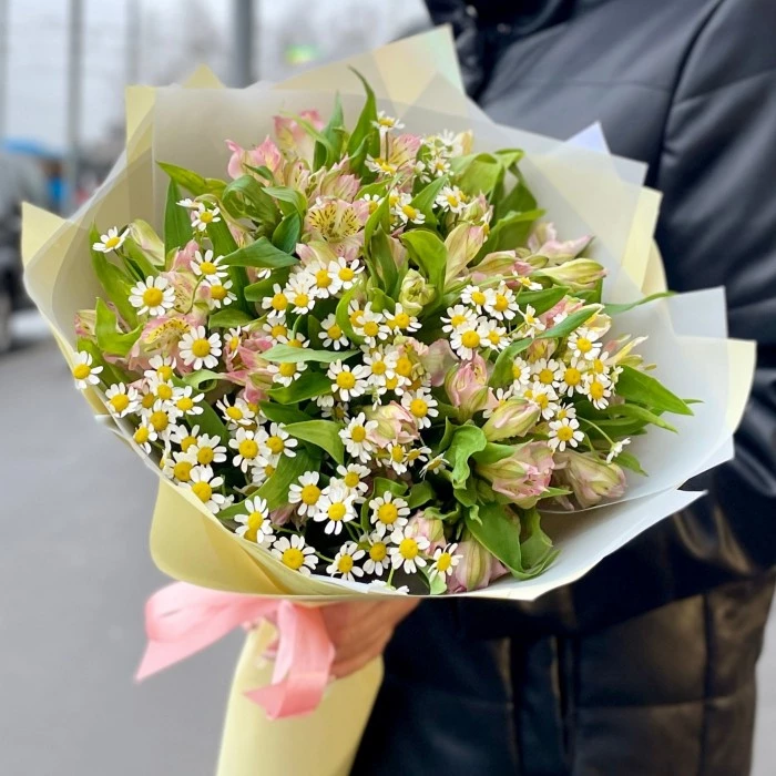 Нежный букет цветов в розово-жёлтых тонах. В состав букета входят розовые альстромерии и танацетум. Такой букет можно подарить маме в знак внимания или взять его с собой на свидание.