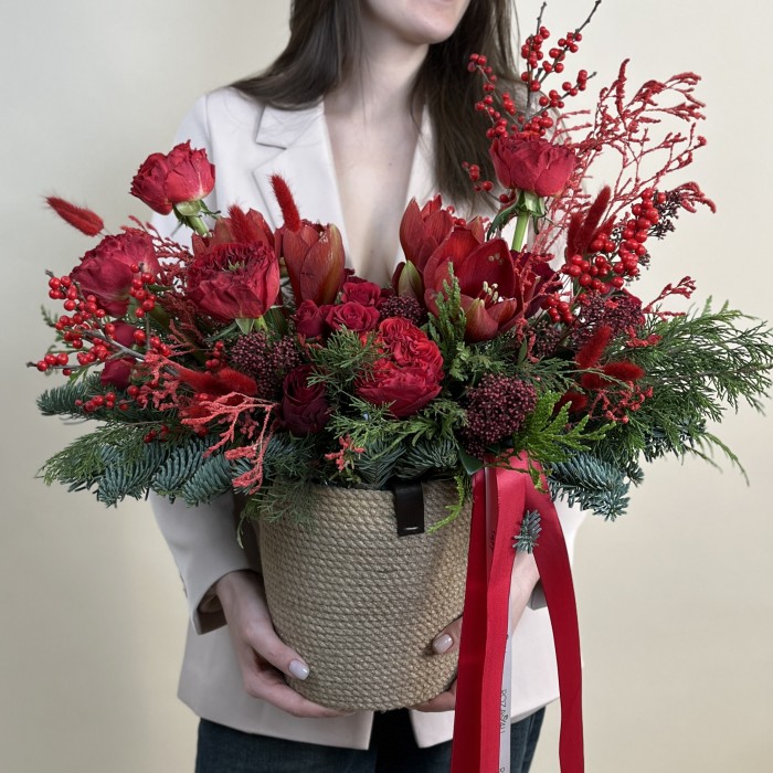Эта композиция является воплощением страсти и элегантности. В центре внимания — яркие, насыщенные красные амариллисами с их крупными, эффектными цветами, символизирующими любовь и красоту.