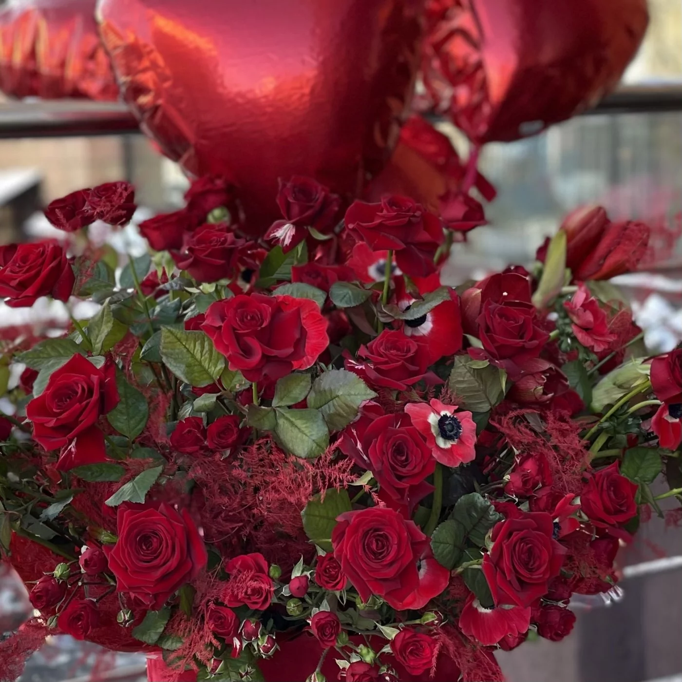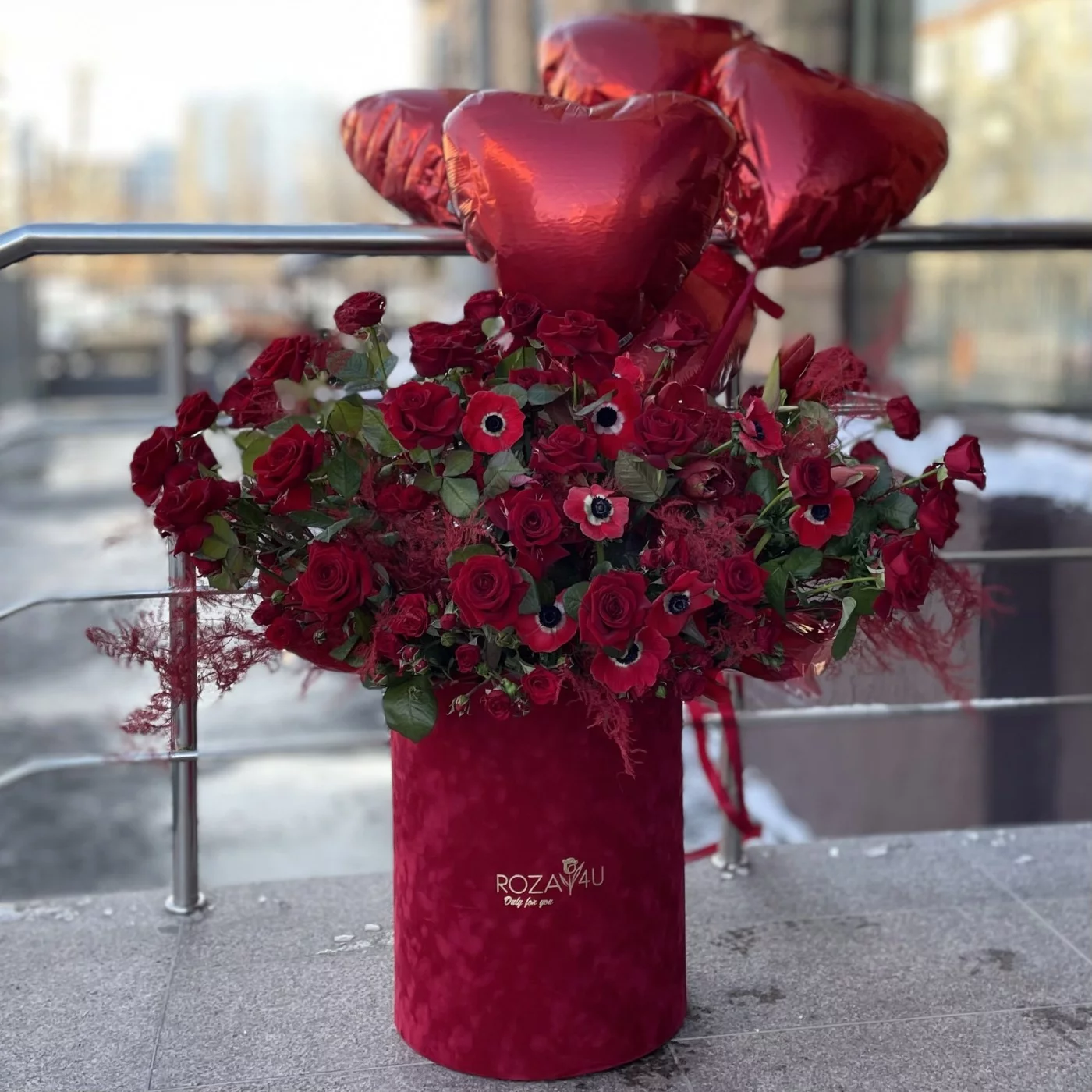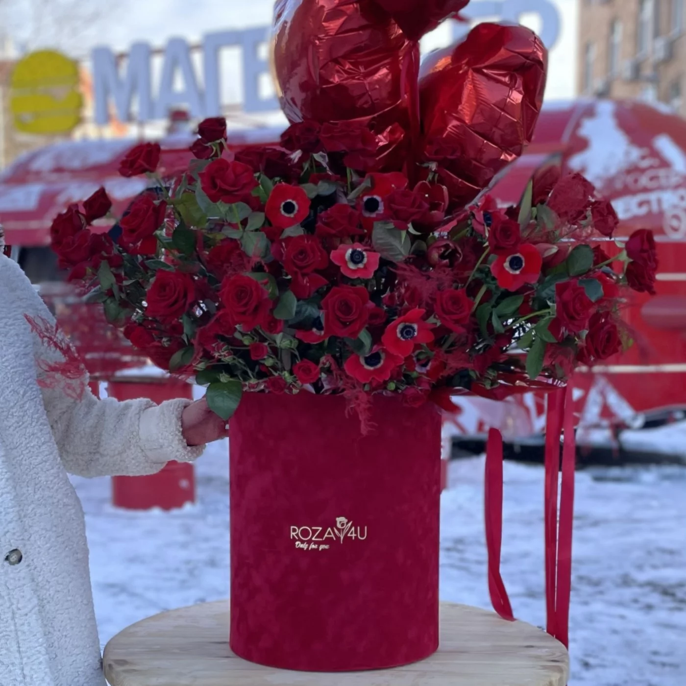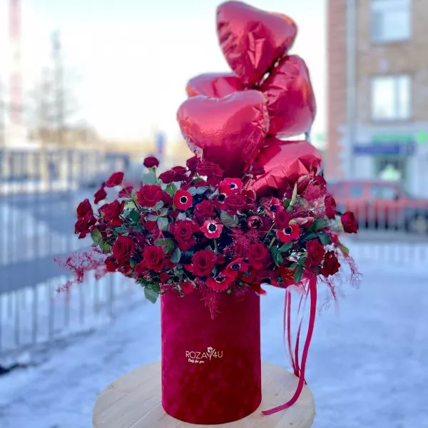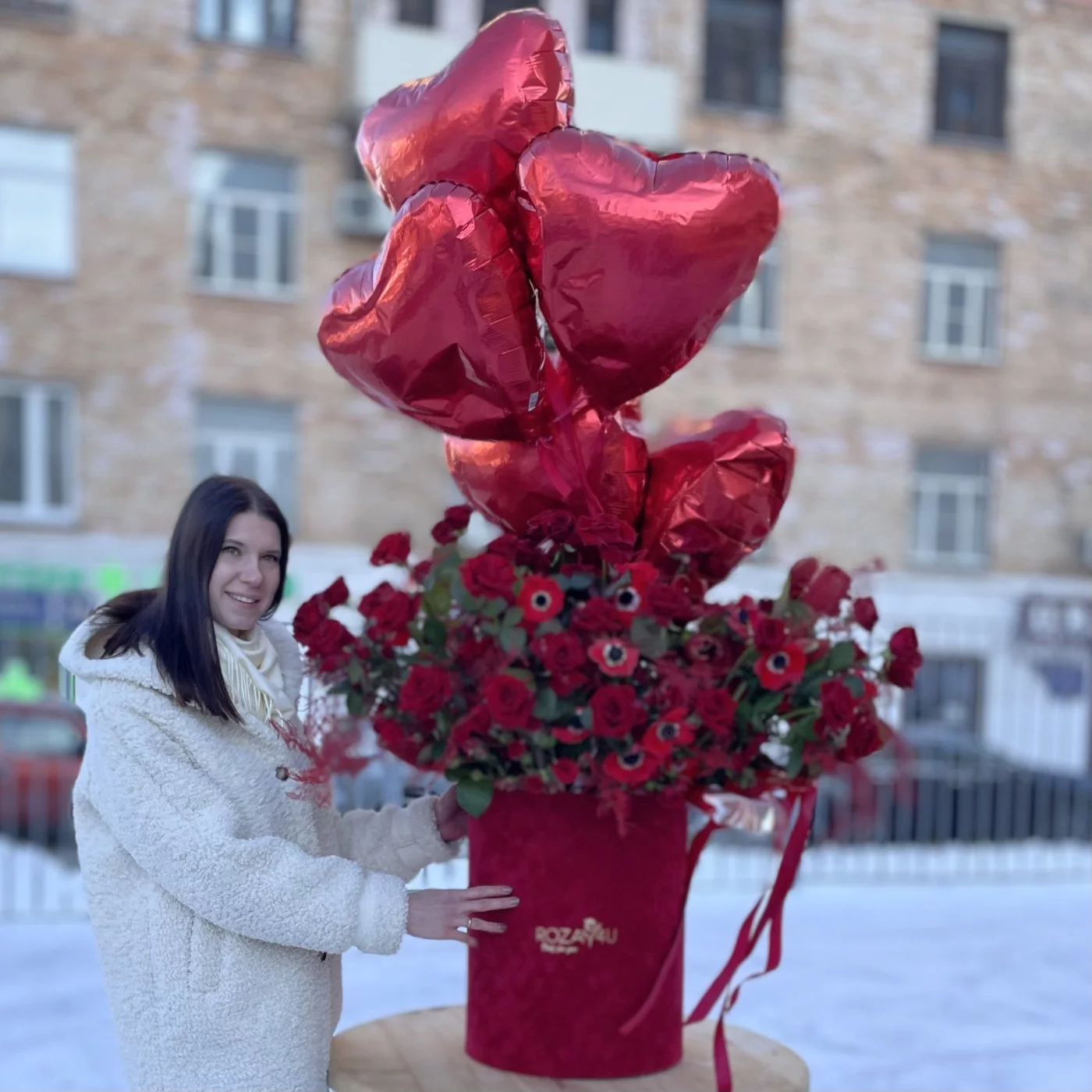 Большая бархатная коробка с красными розами, анемонами и шарами сердца, станет удивительным и шикарным подарком для вашей любимой. С такой коробкой можно сделать предложение руки и сердца или подарить на 14 февраля и день рождения.