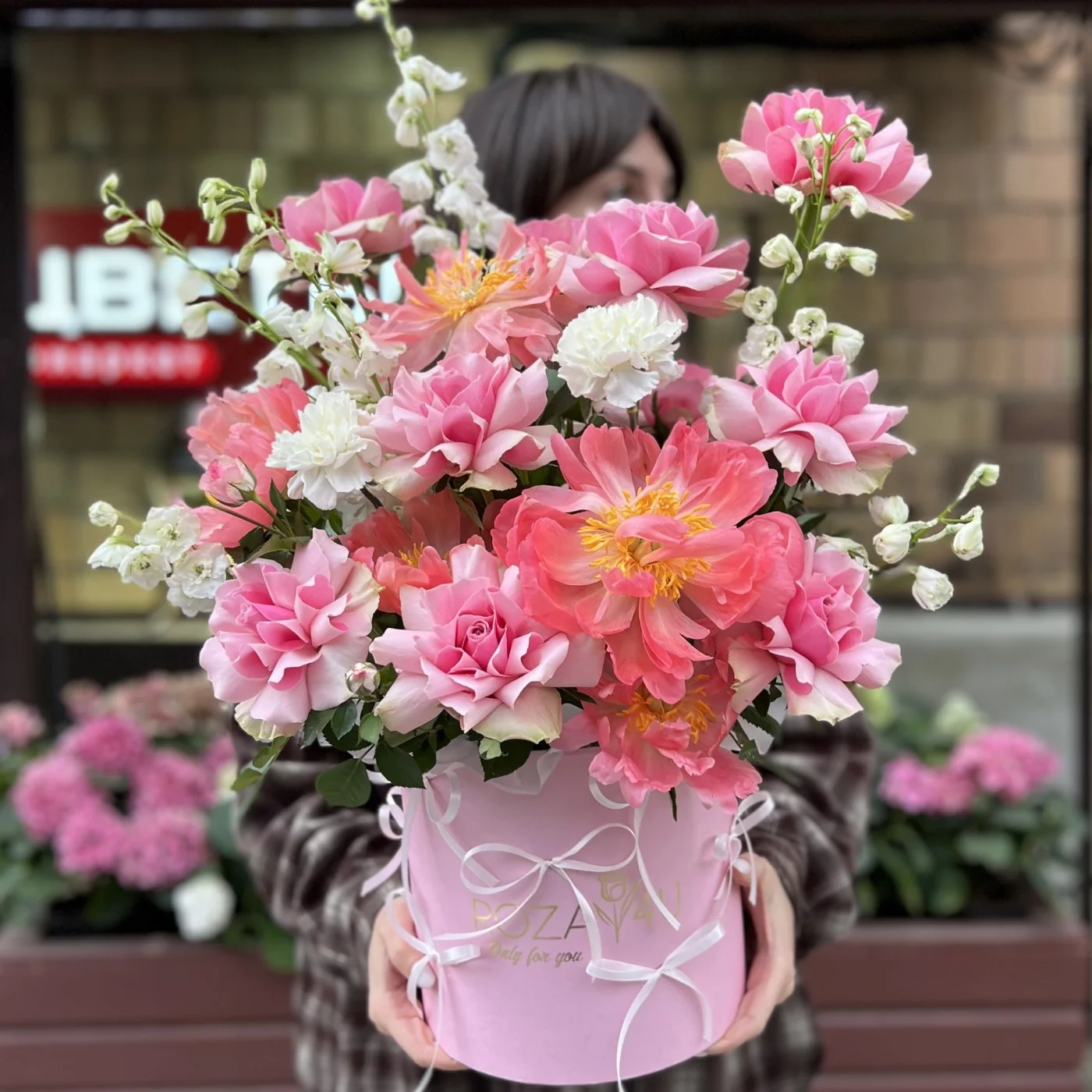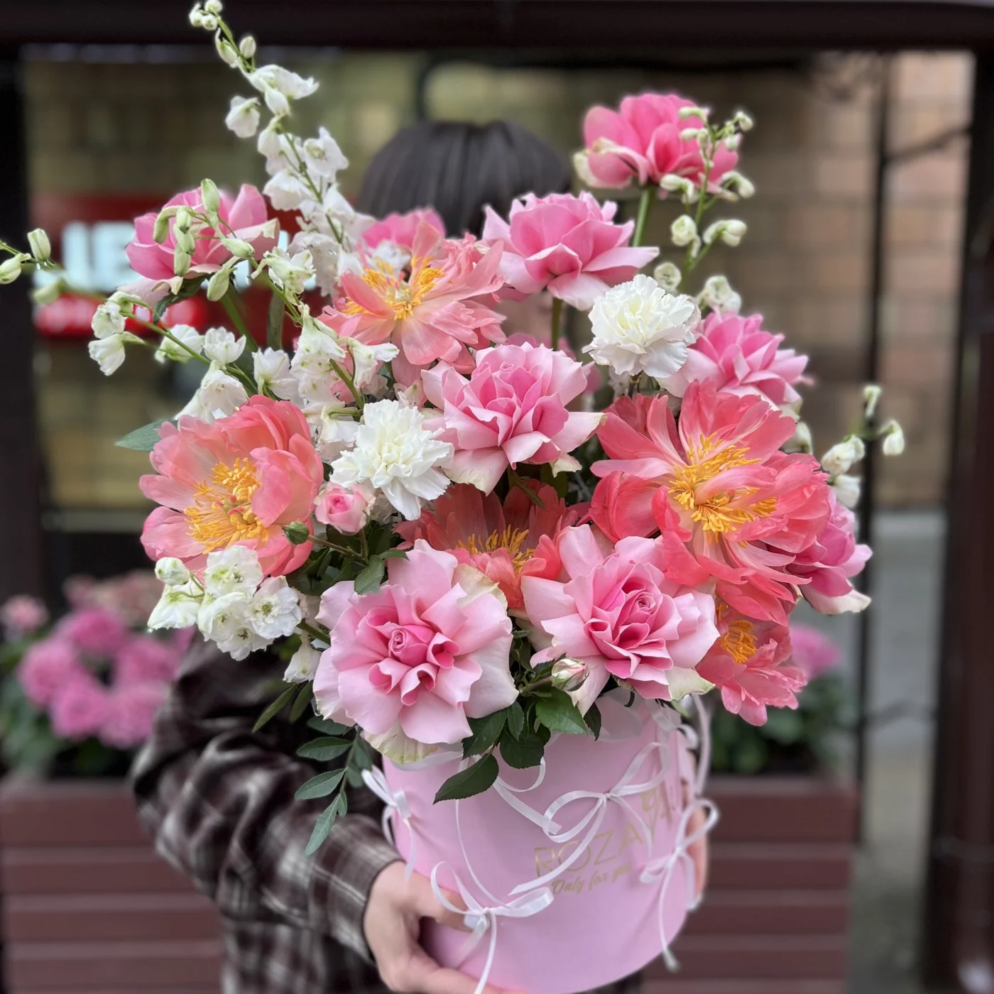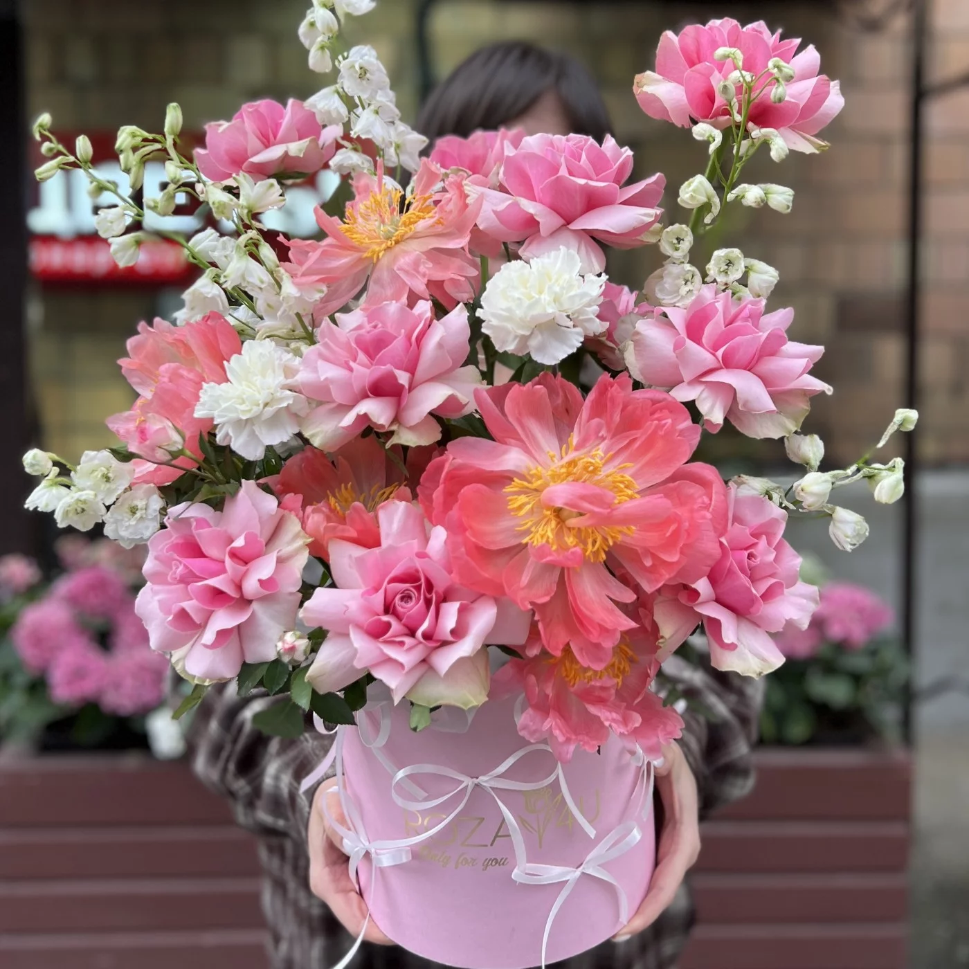 Авторская коробка с розами и коралловыми пионами — это великолепное сочетание, которое не оставит никого равнодушным! Розы, символизирующие любовь и страсть, в сочетании с нежными коралловыми пионами, которые олицетворяют красоту и романтику, создают потрясающую композицию.