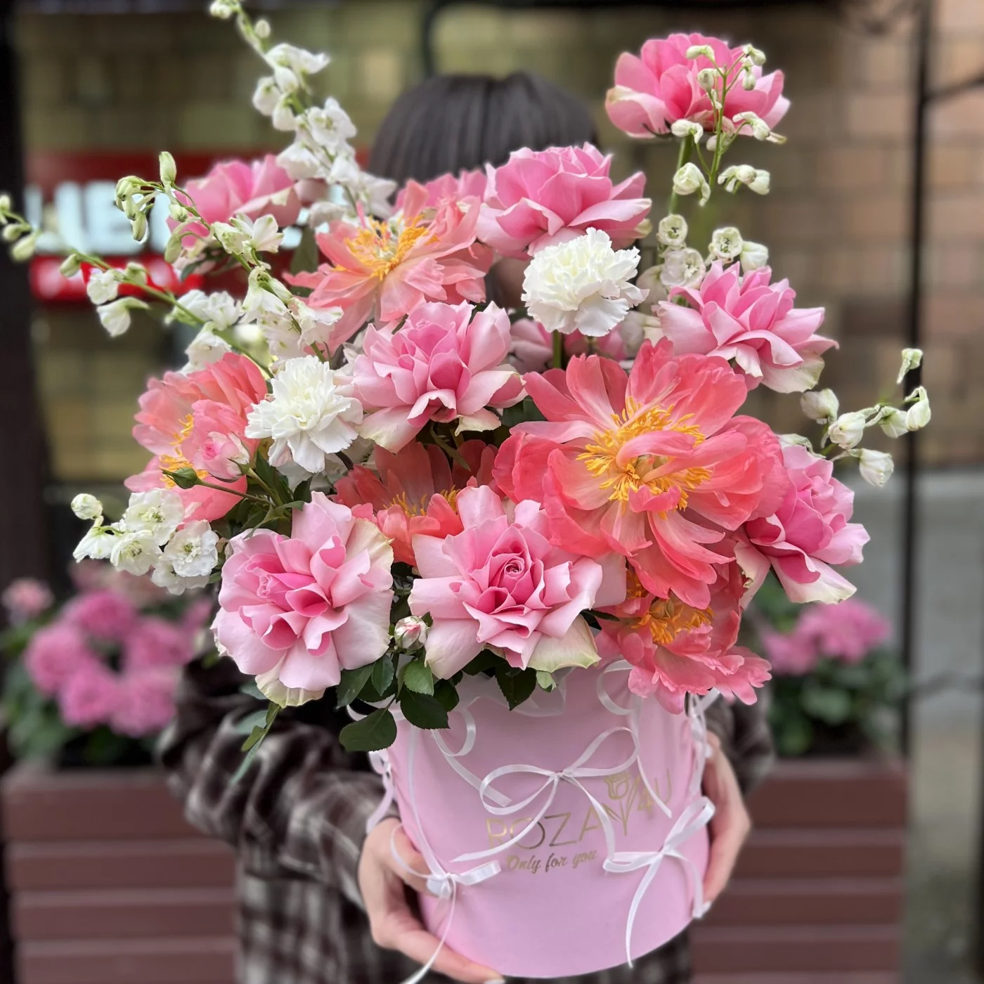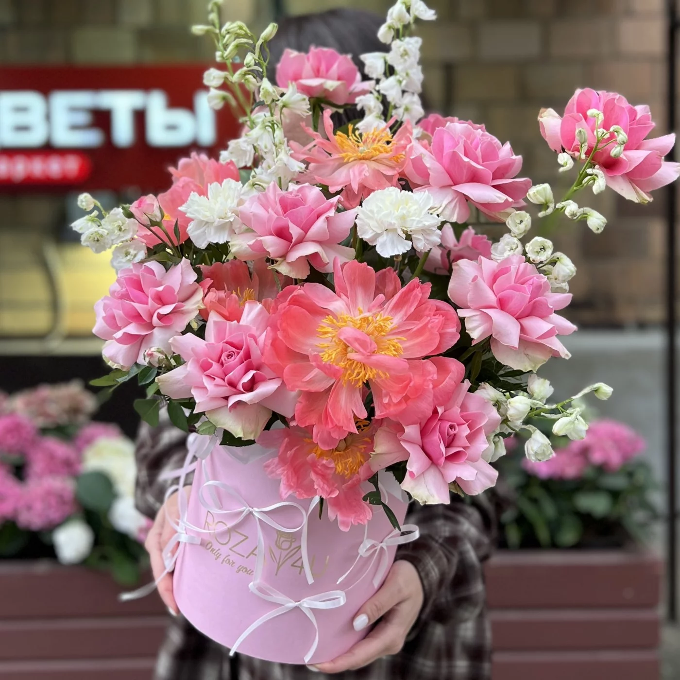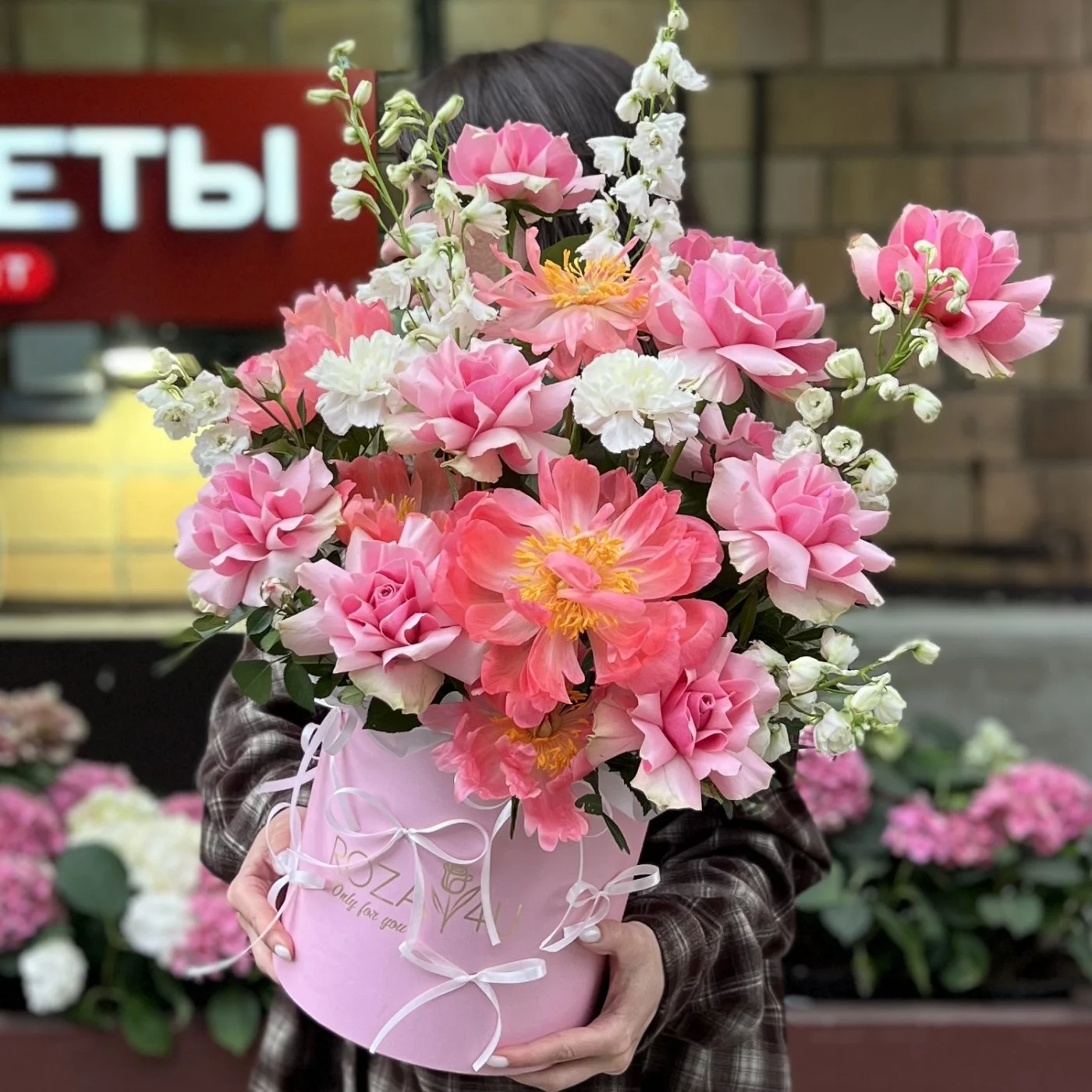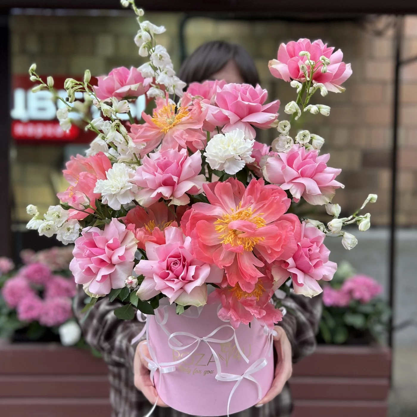 Авторская коробка с розами и коралловыми пионами — это великолепное сочетание, которое не оставит никого равнодушным! Розы, символизирующие любовь и страсть, в сочетании с нежными коралловыми пионами, которые олицетворяют красоту и романтику, создают потрясающую композицию.