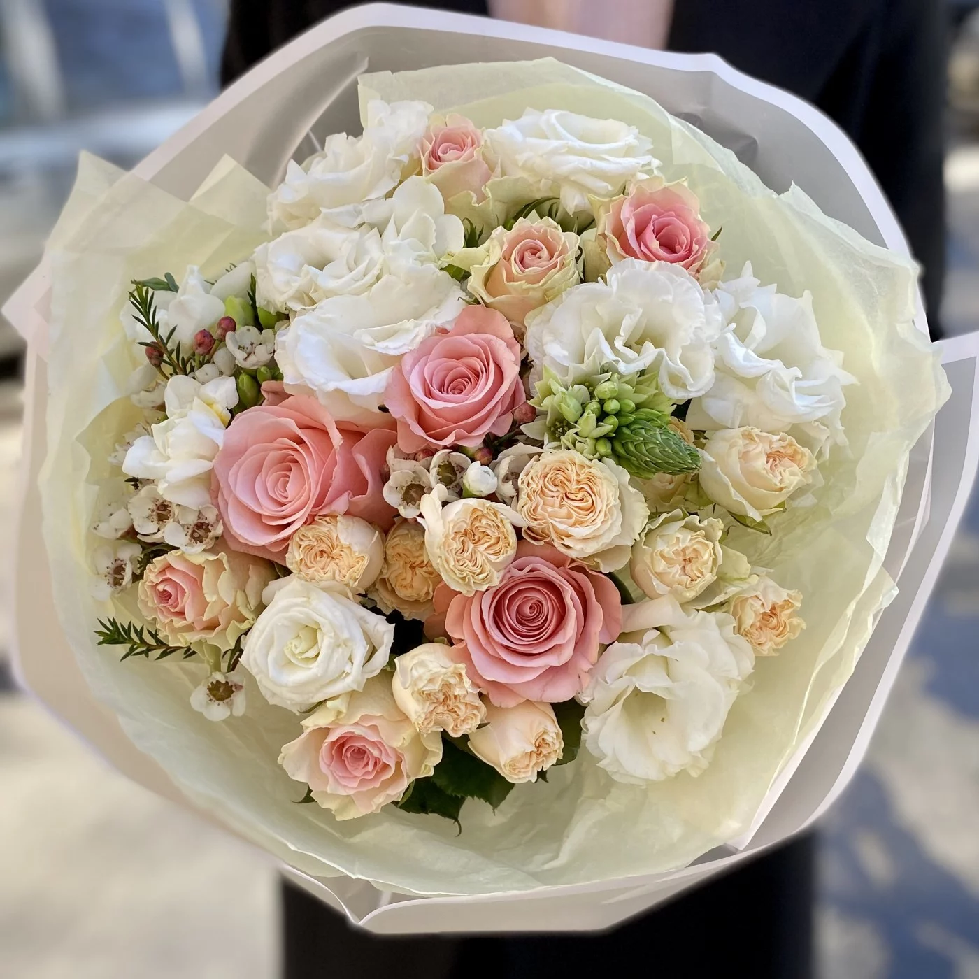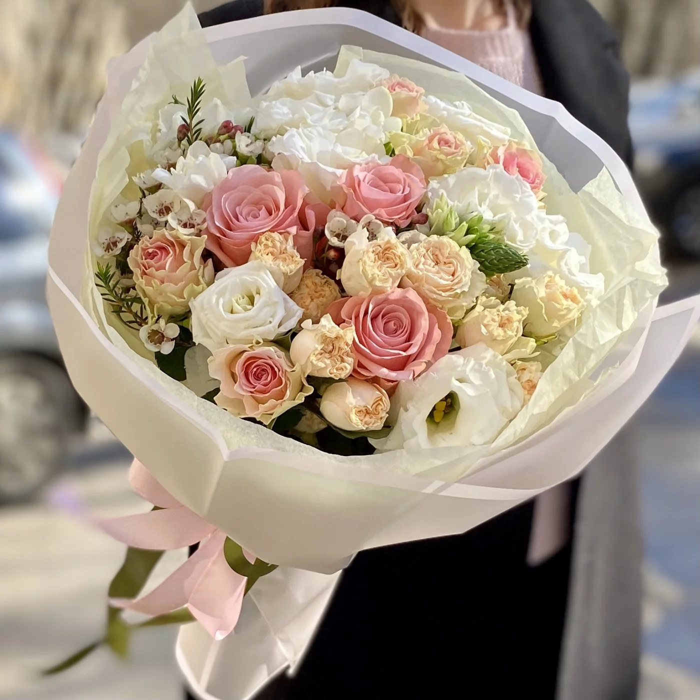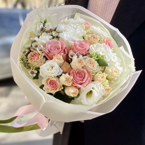 Классический букет нежно-розового цвета в стильной упаковке. Небольшой, но очень красивый вариант презента на любое событие. В состав букета входят нежная эустома, пионовидные розы и ароматный шамелациум.