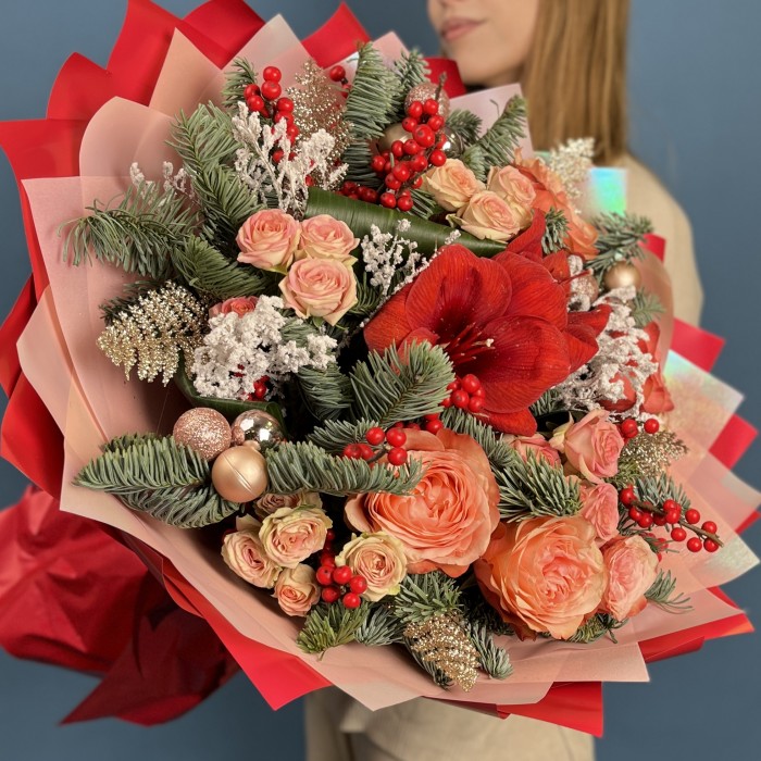 Авторский букет с амарилисом, станет великолепным украшением для любого праздника или подарком для близких. Его красота и изысканность обязательно понравятся получателю.
