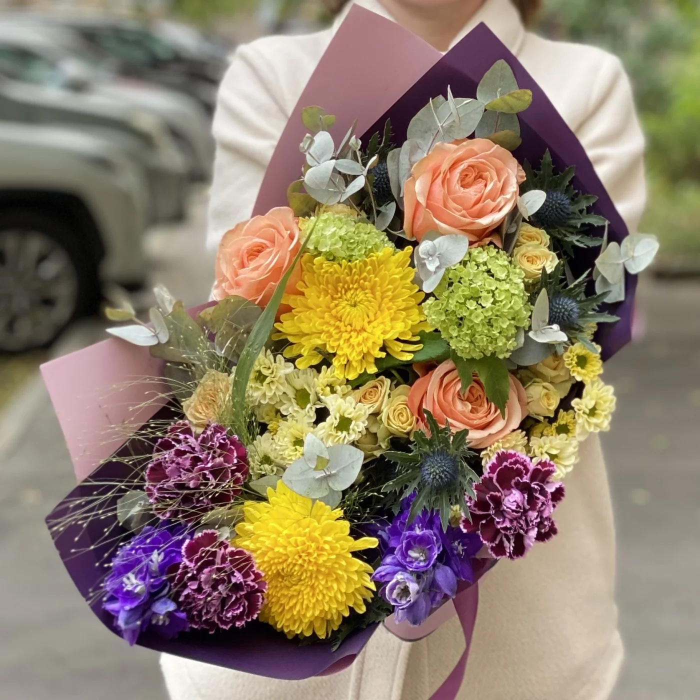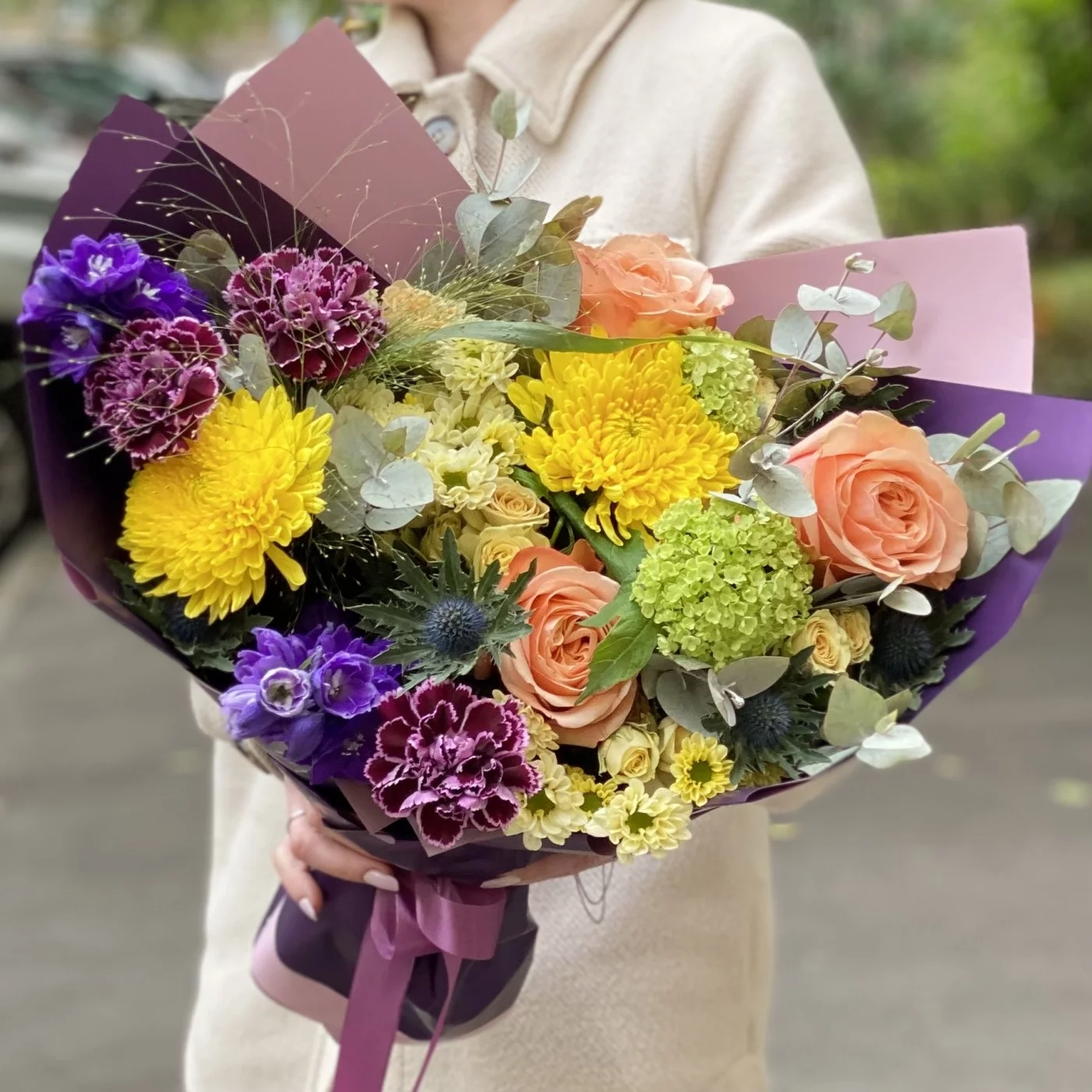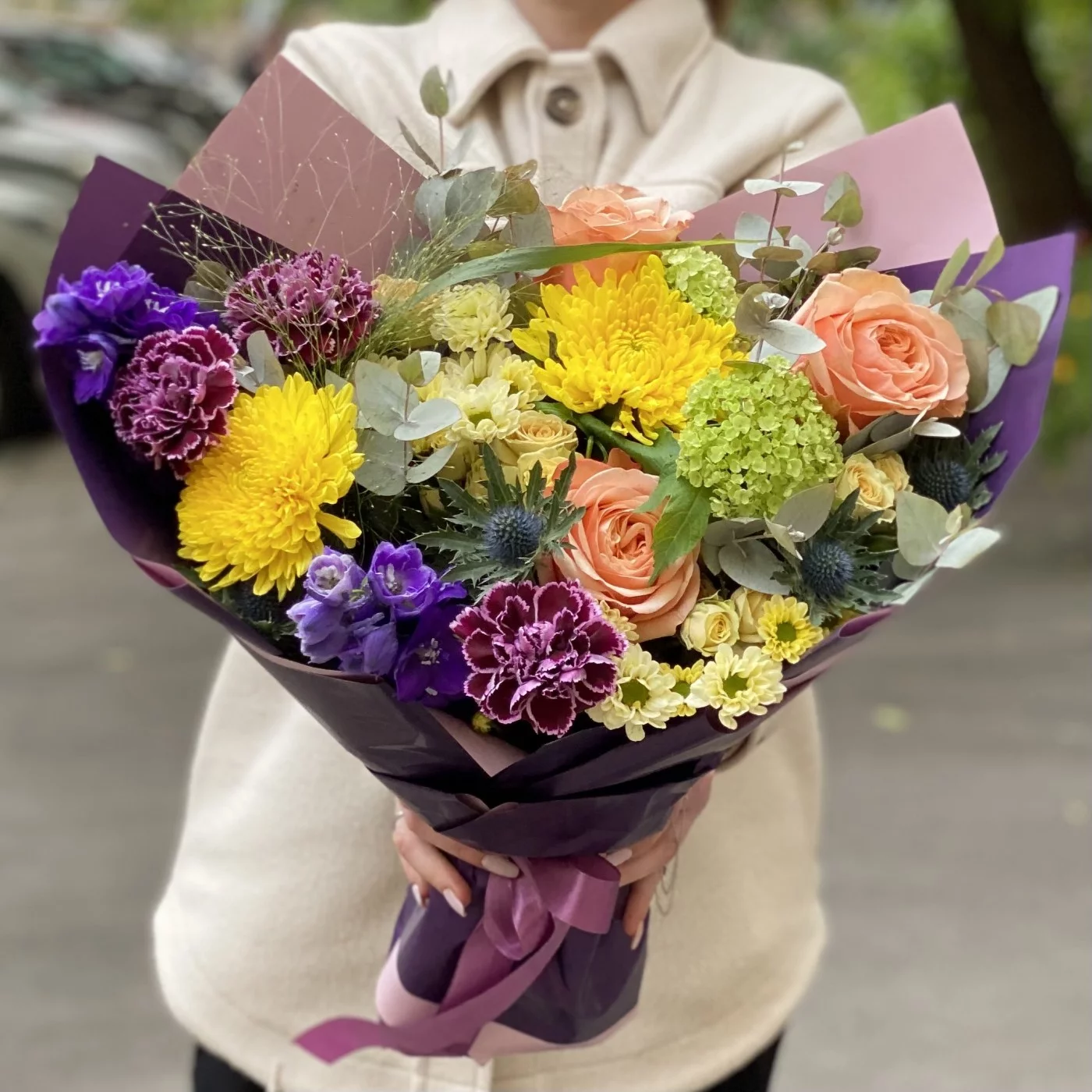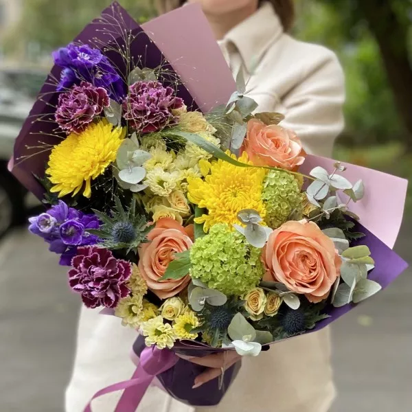 Сказочный и необычный букет, смелый по сочетанию оттенков и фактур. Такой букет сможет приятно удивить представителя креативных профессий- художников и дизайнеров. Яркие и позитивные цветы поднимут настроение в самый хмурый день.