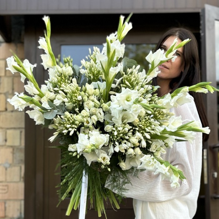 Букет Аура с белыми гладиолусами, эустомой и кустовой розой станет приятным сюрпризом.