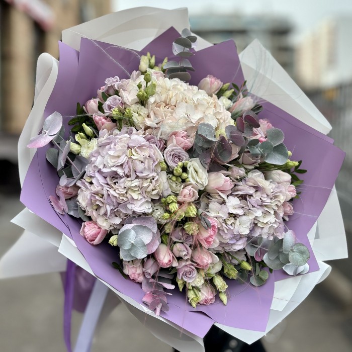 Нежный, авторский букет с тюльпанами, розами, эустомой и гортензией станет незабываемым подарком для любимых.