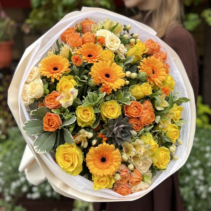 Букет Осенний Шарм вдохновлён красотой осенней природы, сочетая тёплые и насыщенные оттенки, которые отражают богатство этой поры года. Он создаёт атмосферу уюта и тепла, идеально подходя для осенних мероприятий и праздников.