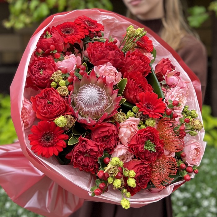 Букет Рубиновый Вальс вдохновлён страстью и элегантностью, символизируя любовь и романтику. Его яркие и насыщенные цвета создают атмосферу торжества и волшебства, идеально подходя для особых случаев.