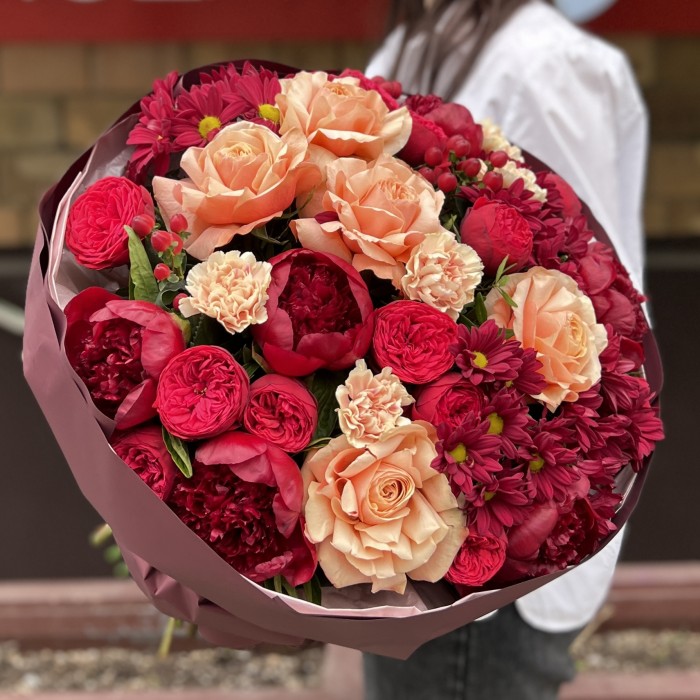 Авторский букет с пионами и розами — это воплощение изящества и утончённой красоты! Пионы, с их пышными, нежными лепестками, символизируют богатство, счастье и романтику, а розы — вечную любовь, страсть и нежность. Вместе эти цветы создают гармоничную и выразительную композицию, которая подойдет для самых важных и трогательных моментов.