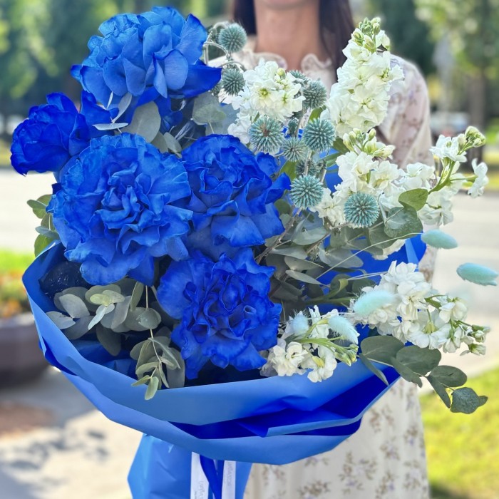 Букет из пышных синих роз, ароматной маттиолы и экзотических колючек эрингиума отлично подойдет в качестве презента на день рождения, именины или свидание.