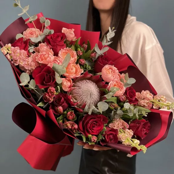 Букет Сияние протеи — это уникальное сочетание экзотической протеи, ярких цветов и зелени, создающее неповторимый и запоминающийся образ.