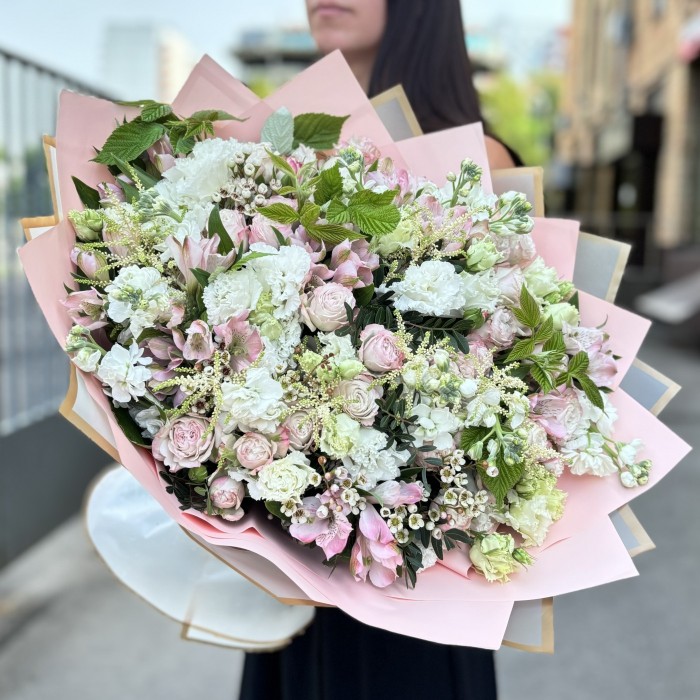 Впечатляющий букет никого не оставит равнодушным! Такой букет украсит торжество. Роскошная композиция прекрасно подойдет ко дню рождения, юбилею, свадьбе.